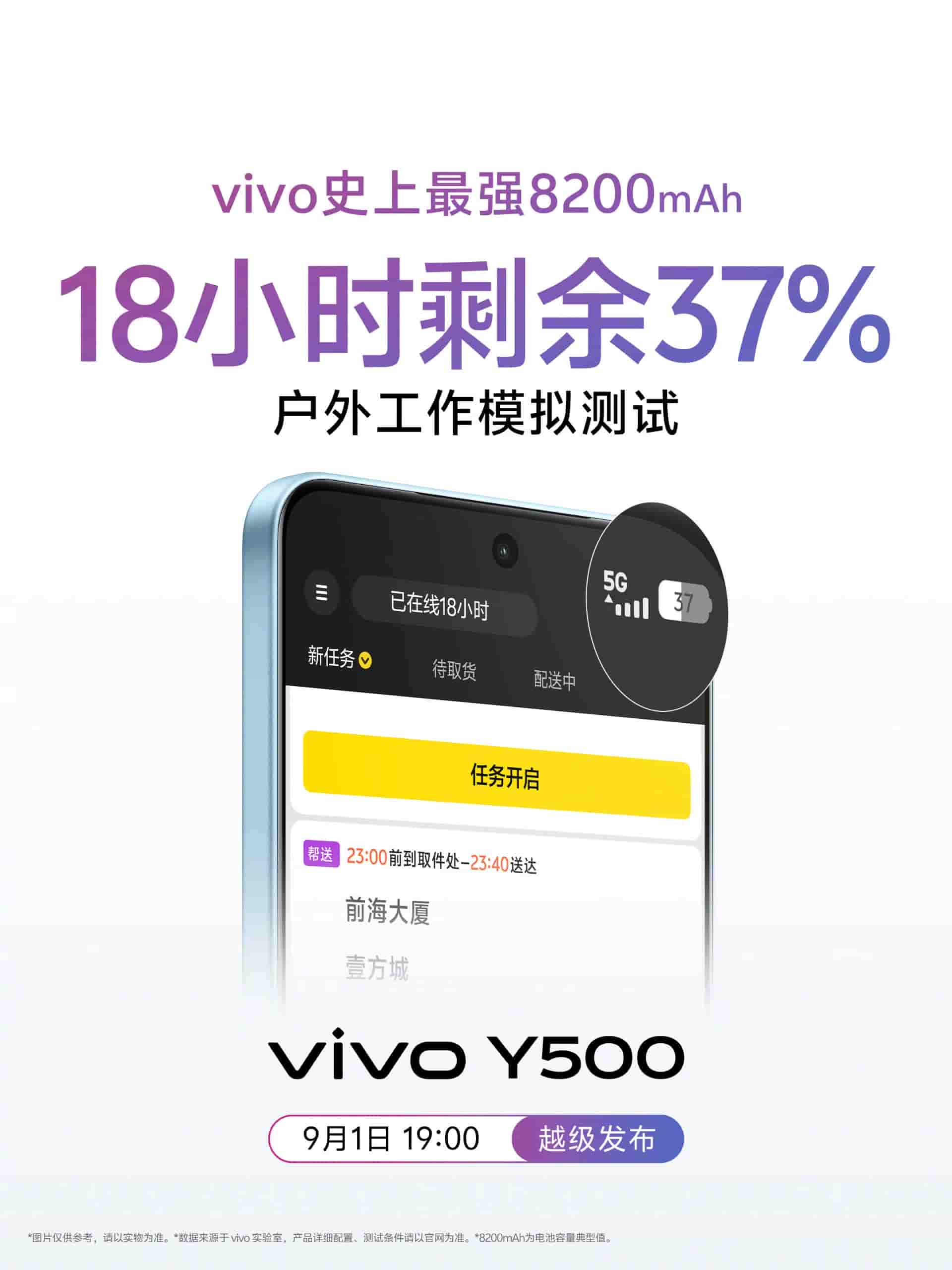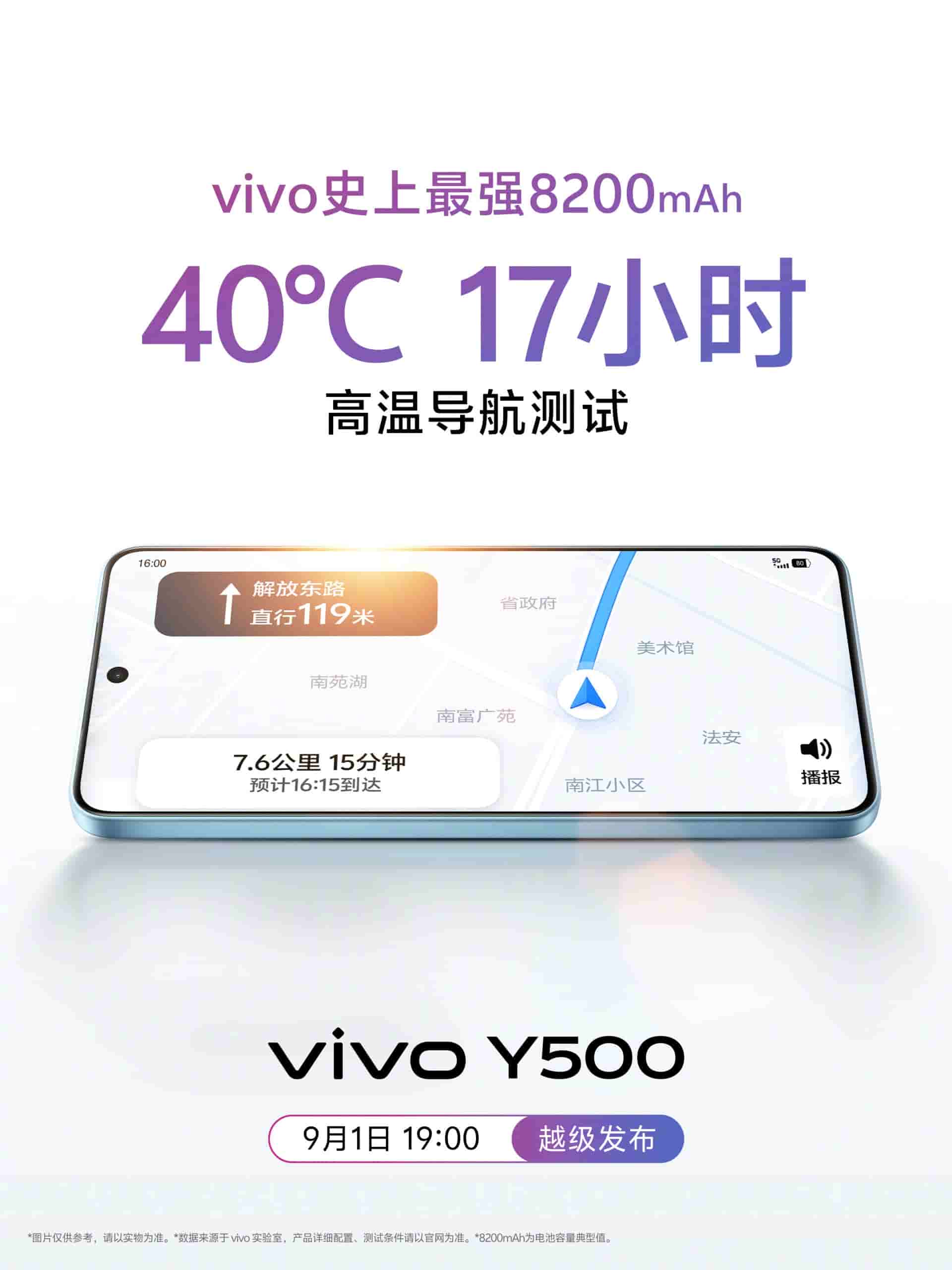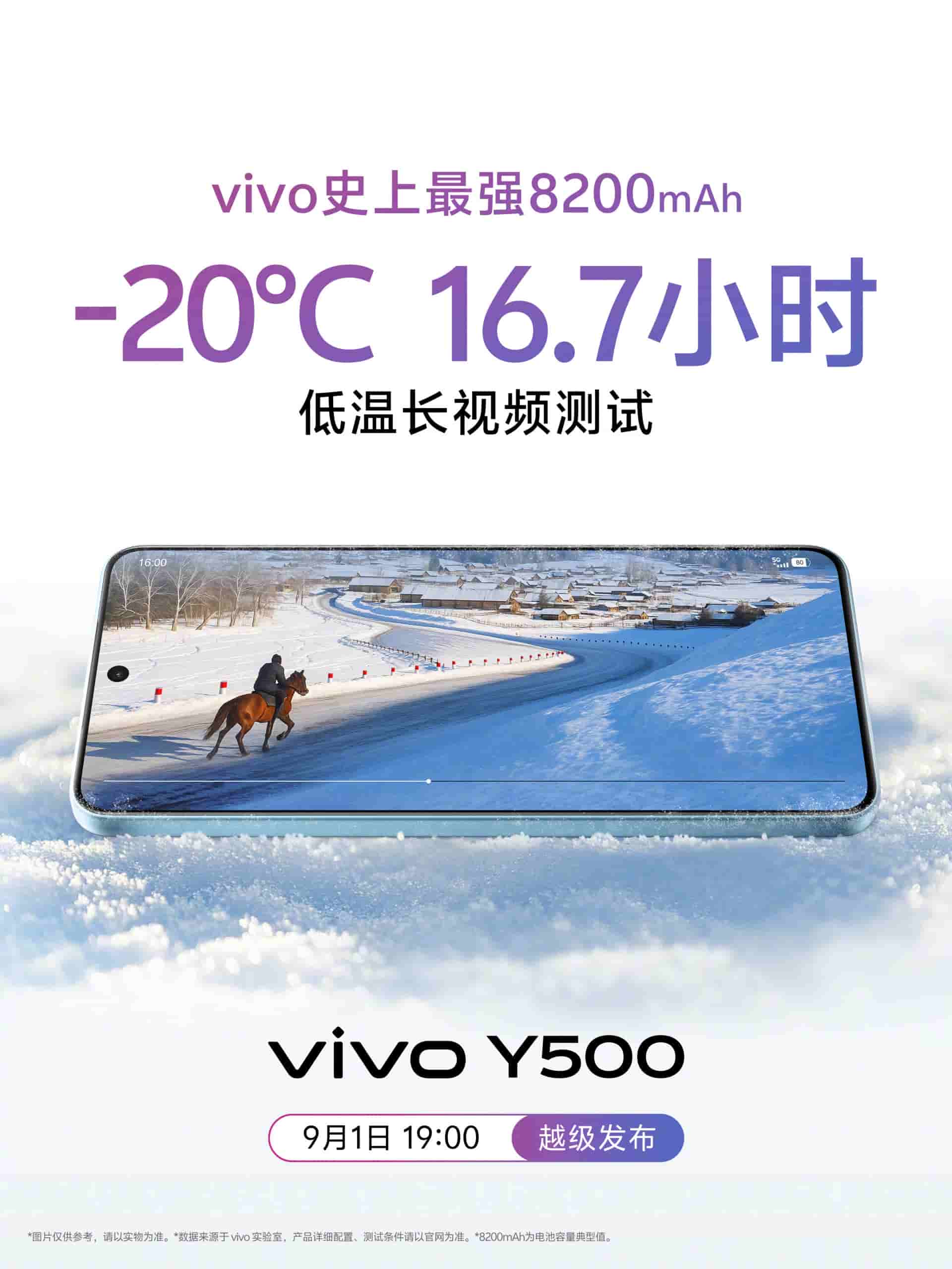 In a teaser shared on Weibo, Vivo confirmed that the Y500 will feature a massive 8,200mAh battery, which the brand claims is its strongest battery to date. Vivo has tested the phone under extreme conditions, which reveals it can do up to 16.7 hours of video playback at -20°C and nearly 17 hours of navigation at 40°C. In simulated outdoor work mode, it reportedly retained 37% charge after 18 hours of continuous usage.