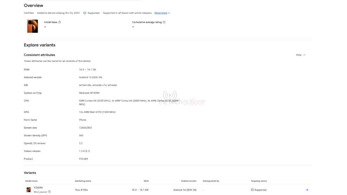 The Vivo X100s smartphone bears the model number – “V2309A”, and it is the 16GB RAM variant of the device that has been listed on the Google Play Console database. The device is revealed to have the Android 14 operating system pre-installed on it, and it will be equipped with a MediaTek processor having the model number – “MT6989”.