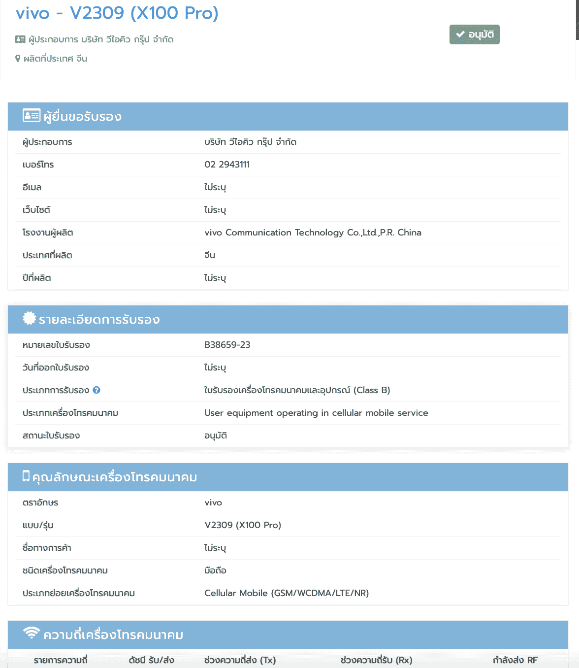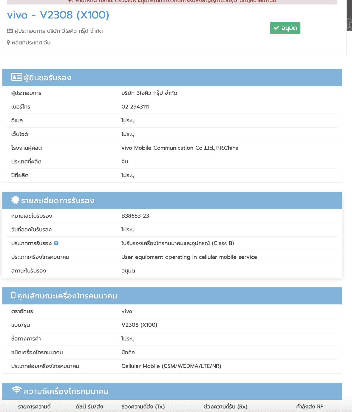 The Vivo X100 and the Vivo X100 Pro smartphones bearing the model numbers – “V2308” and “V2309” have made it to the NBTC database, and are certified with the certificate numbers “B38653-23” and “B38659-23” respectively. The two have been listed as cellular mobiles supporting 2G, 3G, 4G, and 5G network connectivity.