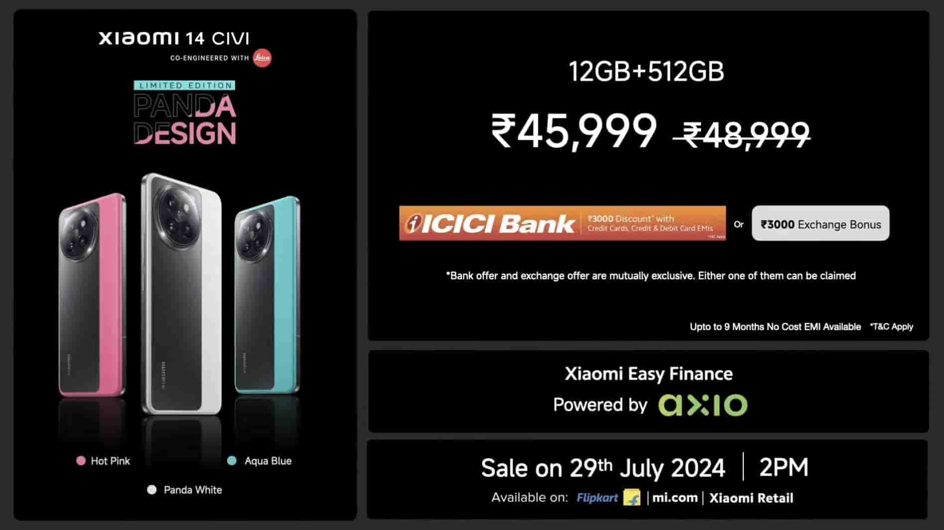 Xiaomi 14 Civi Panda Limited Edition smartphone arrives in a single storage option of 12GB/512GB priced at Rs.48,999. But buyers can purchase this device for Rs.45,999 by availing Rs.3000 instant discount on ICICI credit cards, credit &debit cards EMI transactions, or Rs.3000 exchange bonus. The sale will start today from 2 PM onwards via Flipkart, mi.com, and Xiaomi retail stores.