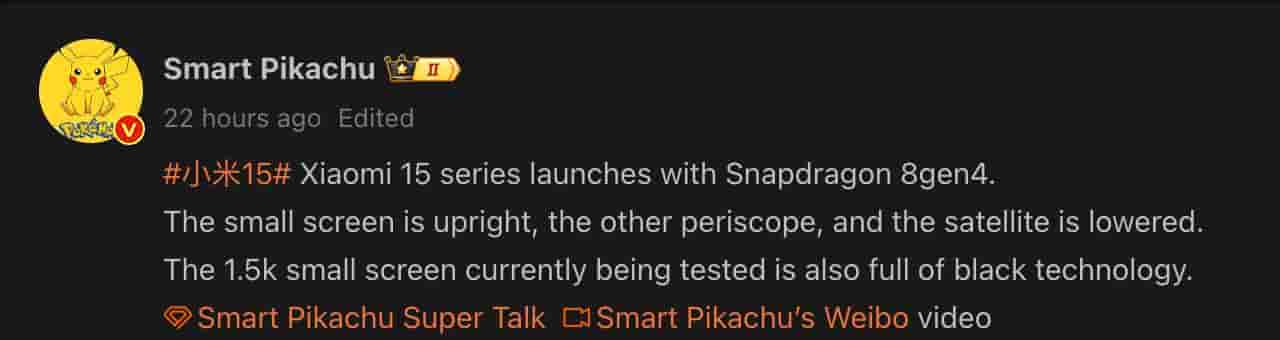 According to the above post, the Xiaomi 15 series is said to launch with the Snapdragon 8 Gen 4 chipset. The small screen is upright while the other periscope and the satellite are lowered. It is also revealed that a 1.5k small screen is currently being tested for the series and is also full of black technology.