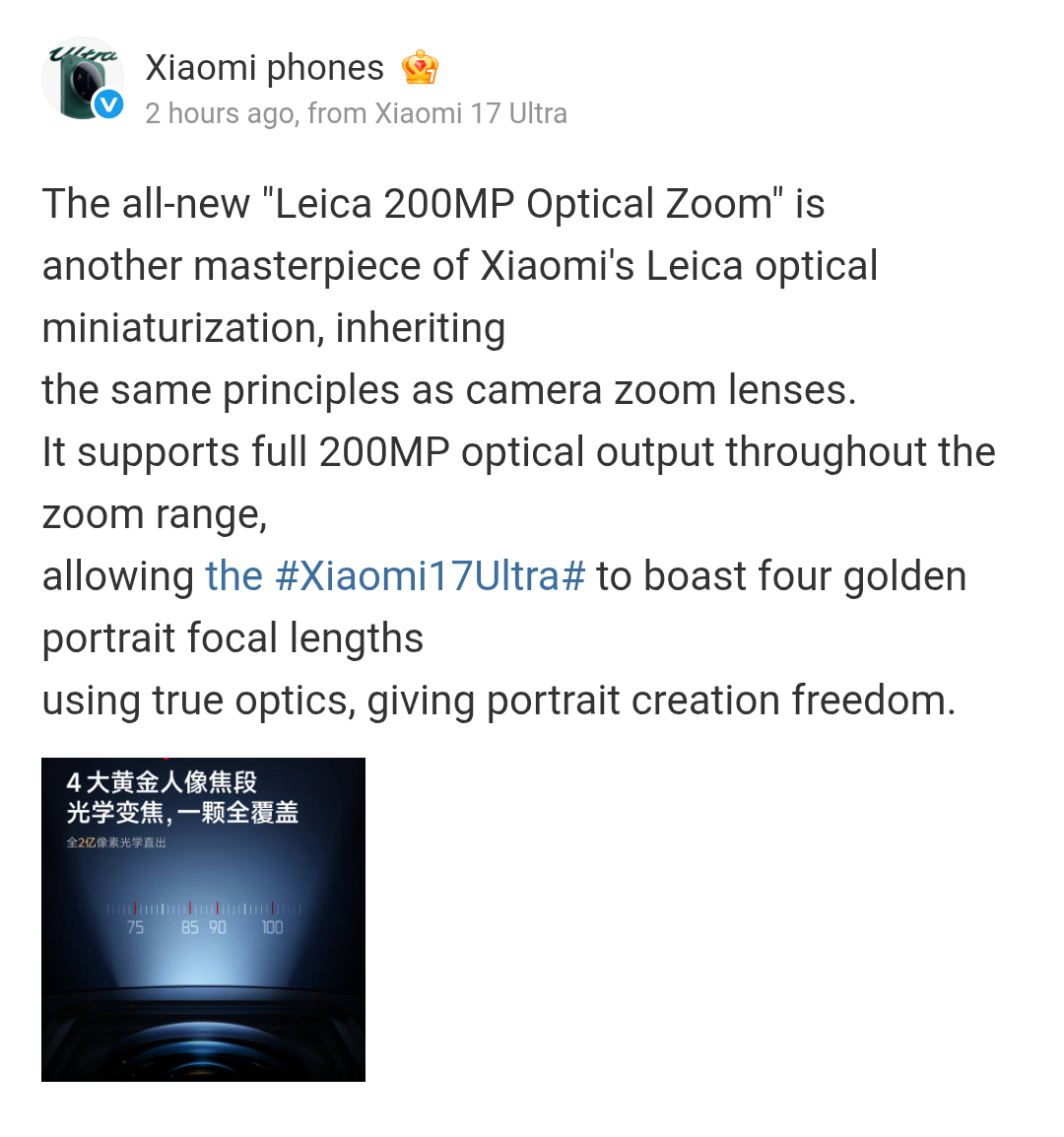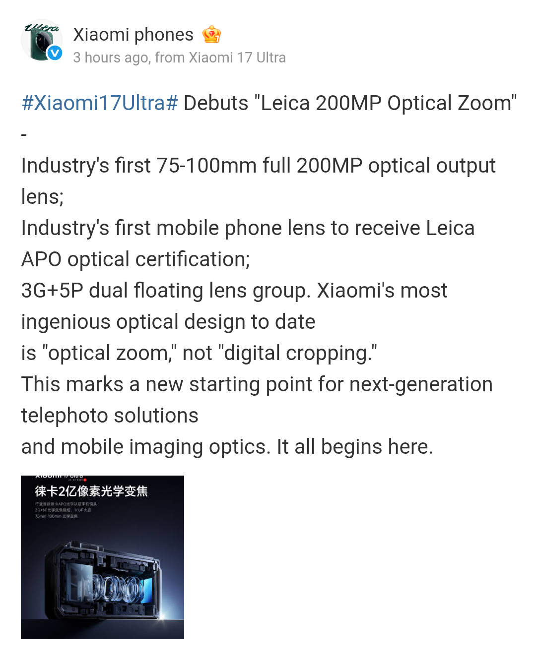 For the telephoto camera, the industry’s first 75 ~ 100mm full 200MP optical output lens has been added, and the Xiaomi 17 Ultra is the first mobile phone to receive the Leica APO optical certification. 3G+5P dual floating lens group is also among the key camera aspects of the device. Also, this camera lens is said to be a masterpiece of Xiaomi Leica optical miniaturization, and it claims full 200MP optical output across all zoom range, further boasting four golden portrait focal lengths (75mm, 85mm, 90mm, 100mm)
