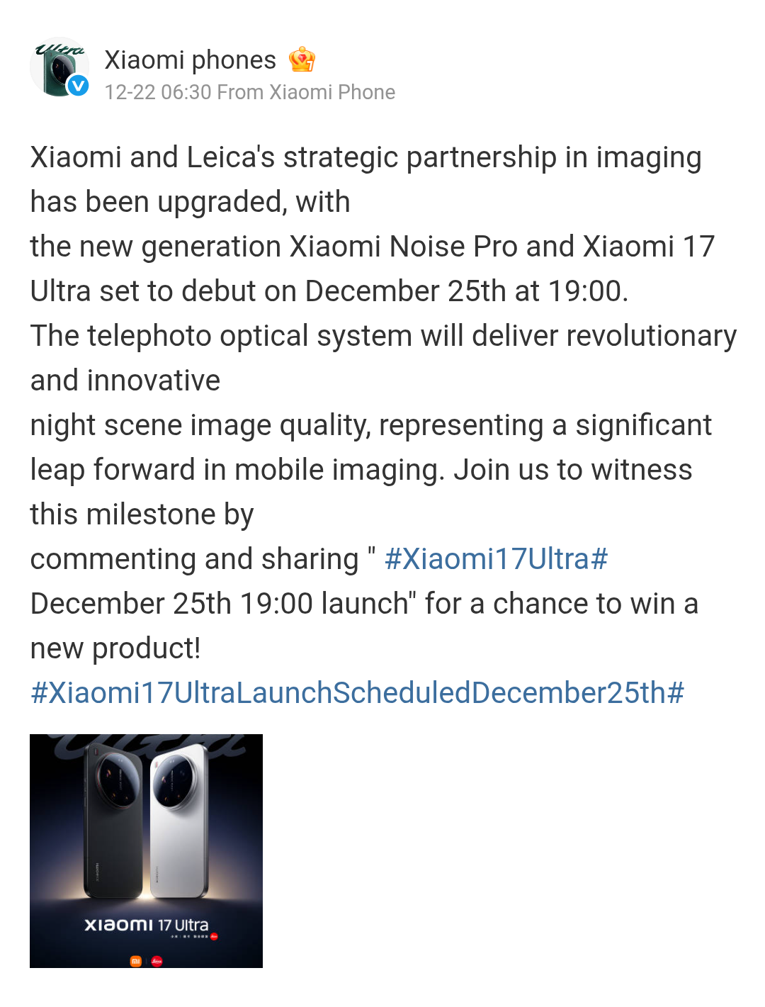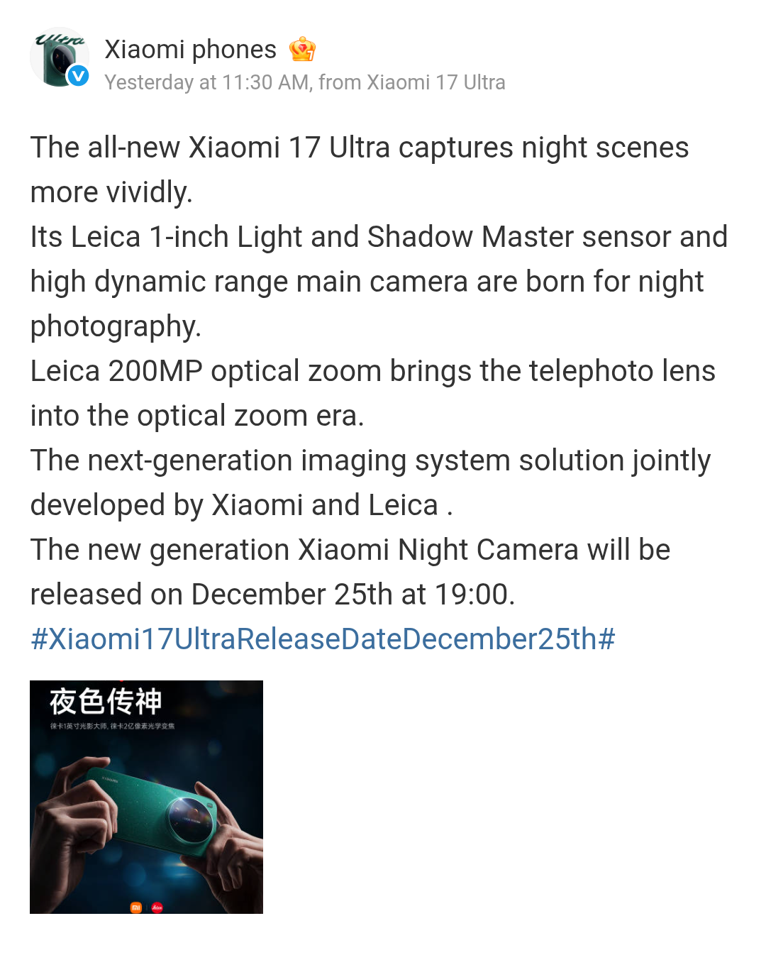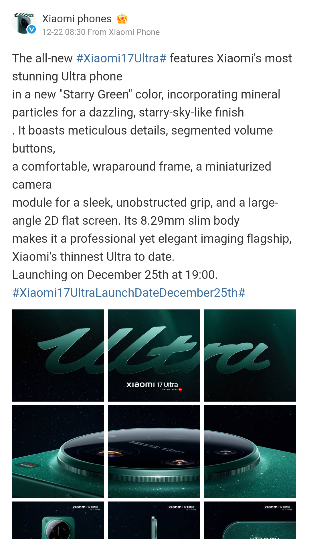 As earlier expected, Xiaomi’s 17 Ultra iterative camera flagship is now officially confirmed to debut on the 25th of December 2025 in the Chinese market at 7:00 PM local time, and in addition to the Black and White color variants, a new Starry Green color variant too will be offered. Segmented volume buttons, comfortable wraparound frame, miniaturized camera module, large-angle 2D flat screen, mineral particles for a starry finish (for Starry Green color), and an 8.29mm slim body are a few of its teased design aspects.