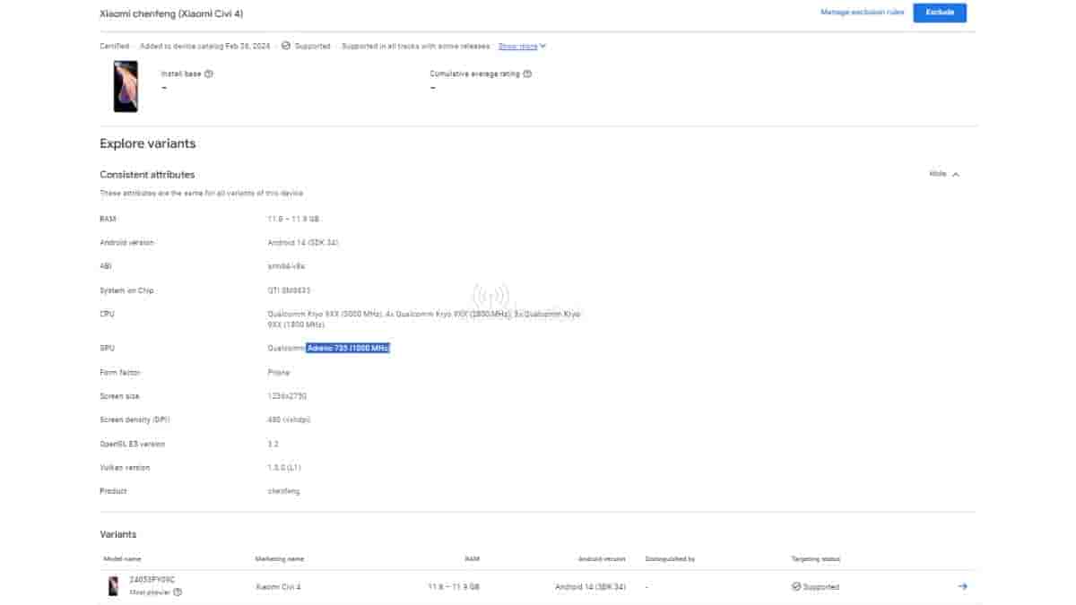Just a few days back, we spotted the moniker “Xiaomi Civi 4” on the Google Play Console listing with the model number “24053PY09C” and the code name “chenfeng.” This is the same model number as the Civi 4 Pro, which was recently released in China. However, earlier when we spotted the Civi 4, it didn’t reveal the CPU and GPU details. But now we do have those details, and it looks like it will be a tweaked version of the Civi 4 Pro.