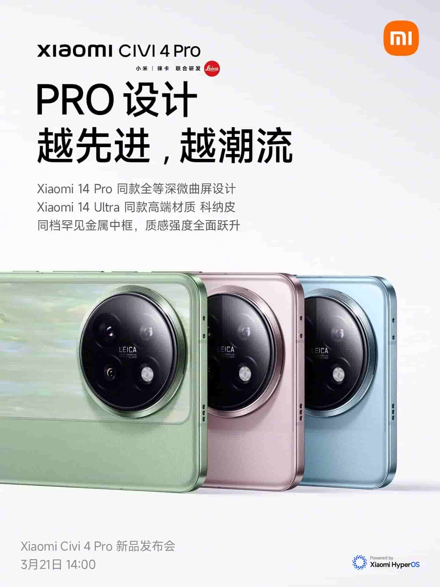 According to the poster images that have now been revealed, the latest Xiaomi Civi 4 Pro smartphone will make its debut in China on the 21st of March 2024 at 2PM local time, and is developed in collaboration with Leica. This upcoming smartphone will also be having some flag-level features.