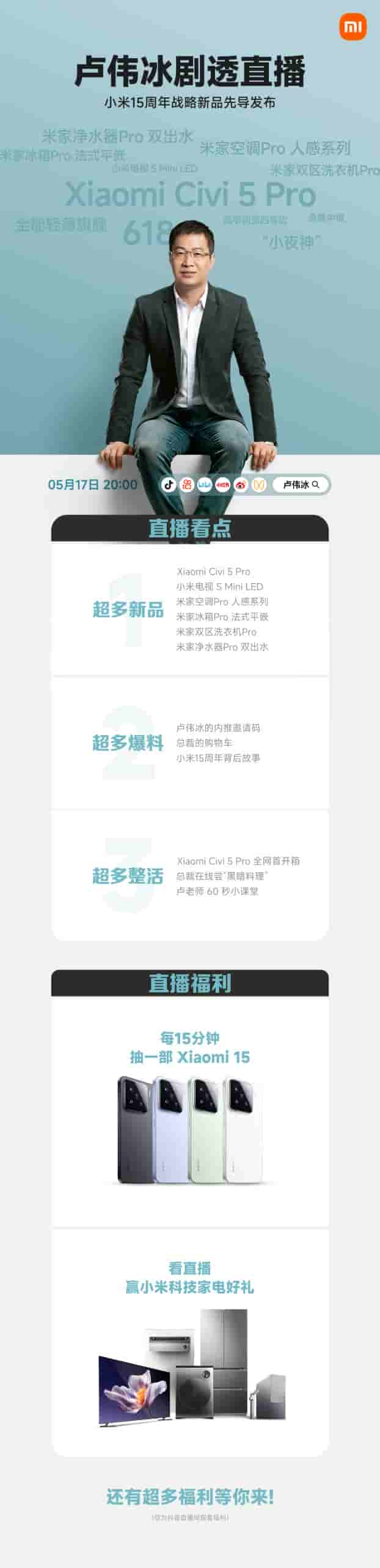 Today in a Live broadcast, Xiaomi ‘s President, Lu Weibing will be sharing the first unboxing of the Xiaomi Civi 5 Pro and will be revealing news related to other upcoming AIoT products- Xiaomi TV S Mini LED, Mijia Air Conditioner Pro Human Sensing Series, Mijia Refrigerator Pro French Style Flat-Inlaid, Mijia Dual Zone Washing Machine Pro and Mijia Water Purifier Pro Dual Outlet.