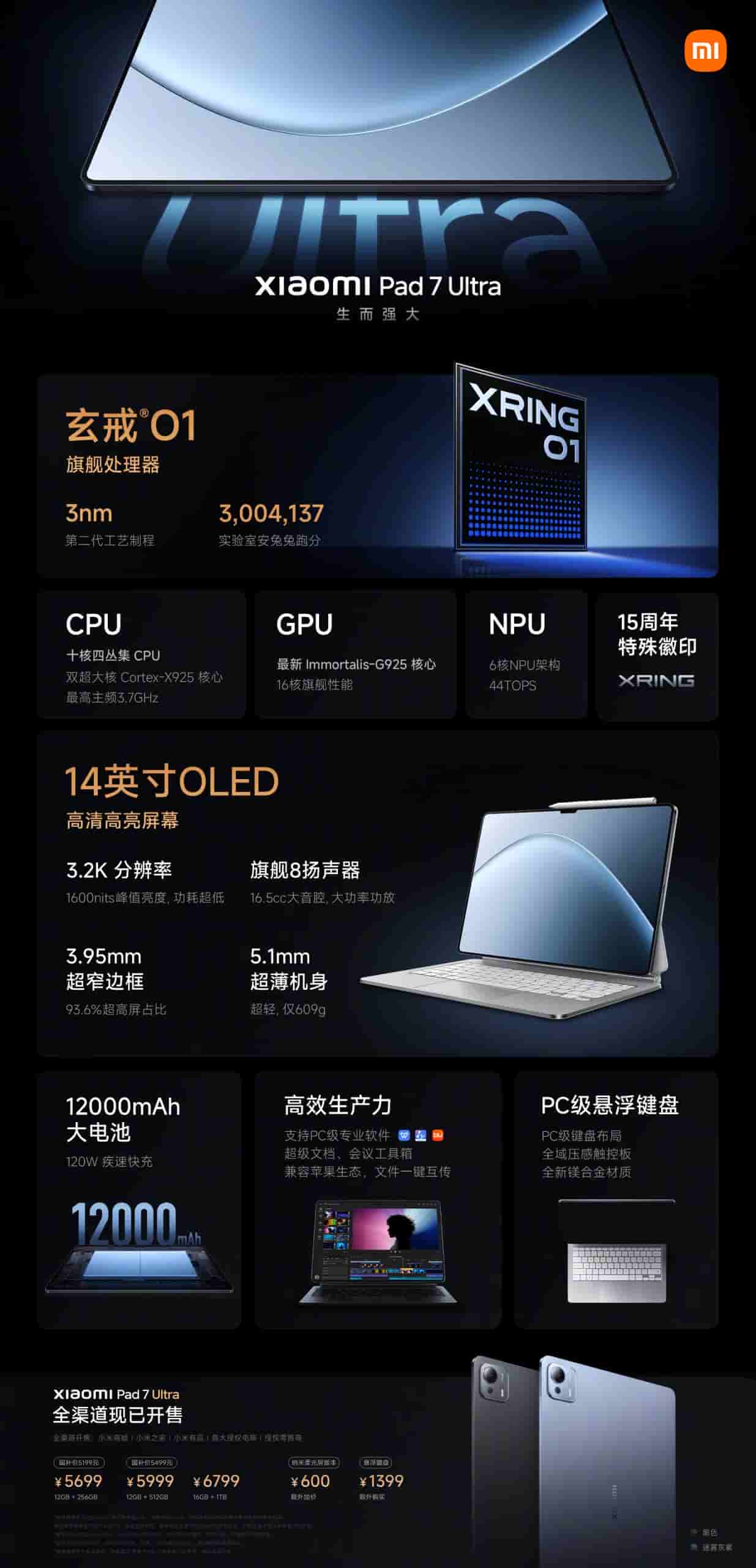 The tablet features a 14-inch OLED display that offers 3.2K resolution and 1600 nits peak brightness. The display supports Dolby Vision, HDR10+, HDR Vivid, ZREAL and TUV Rheinland certifications. It is powered by Xiaomi’s XRING O1 processor, which includes a 10-core CPU with dual Cortex-X925 cores at 3.7Gz, a 16-core Immortalis- G925 GPU and a 6-core NPU delivering 44 TOPS of AI computing power. It is backed by a 12000 mAh battery and supports 120W fast charging.