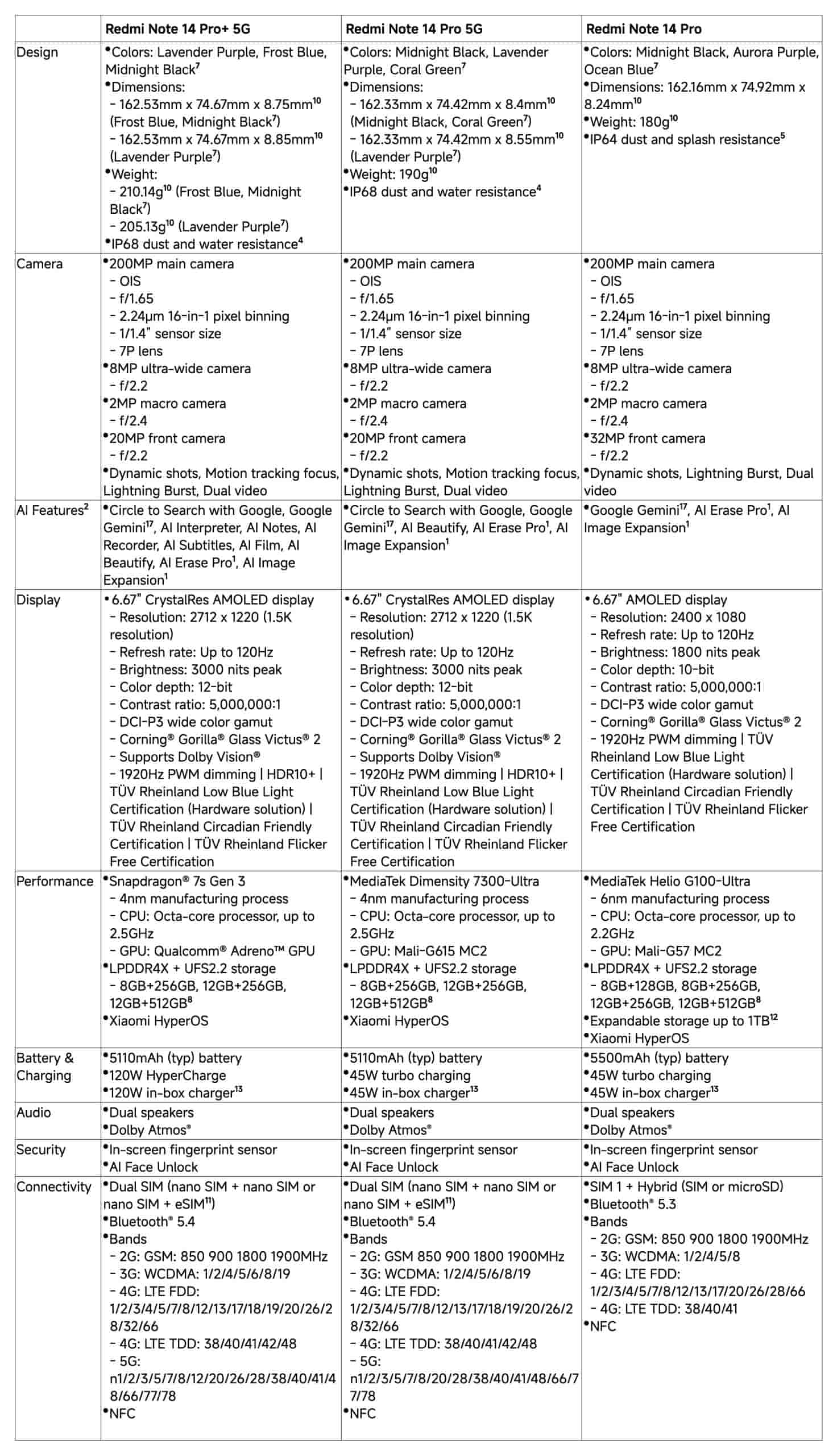 - Redmi Note 14 Pro+ 5G: Three storage options and three color choices (Midnight Black, Lavender Purple, & Frost Blue). Suggested starting retail price – USD 449.
