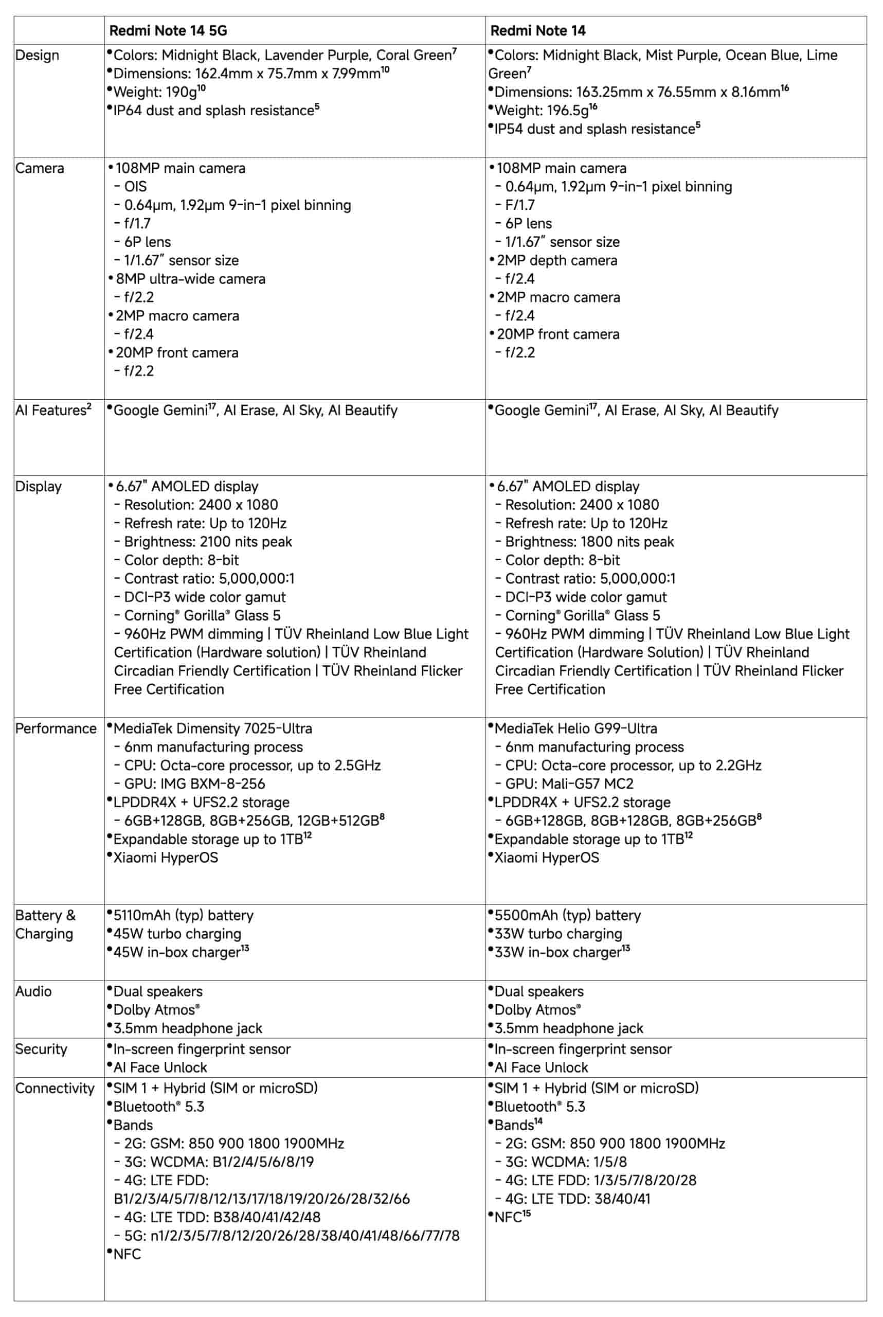 - Redmi Note 14 5G: Three storage options and three color choices (Midnight Black, Lavender Purple, & Coral Green). Suggested starting retail price – USD 299.