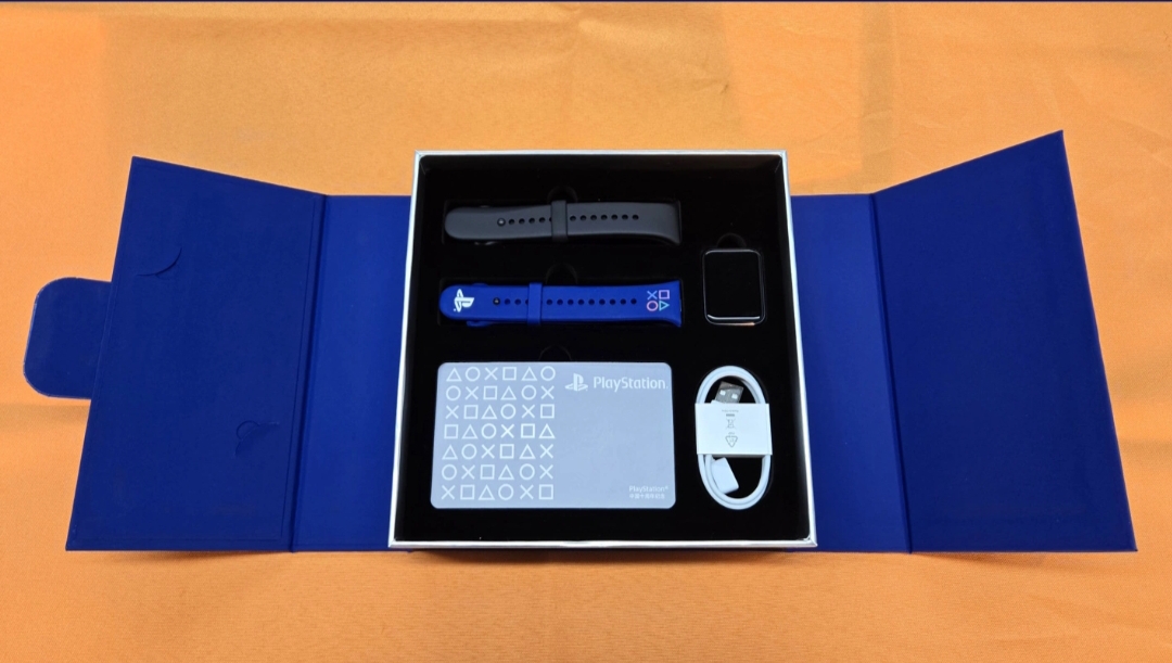 On the packaging box, the word PlayStation is printed while there are also four symbols in the middle representing the four control keys. Meanwhile, on the side, there is a bracelet, two straps- gray and PlayStation themed, a charging cable, and a tenth-anniversary commemorative card.