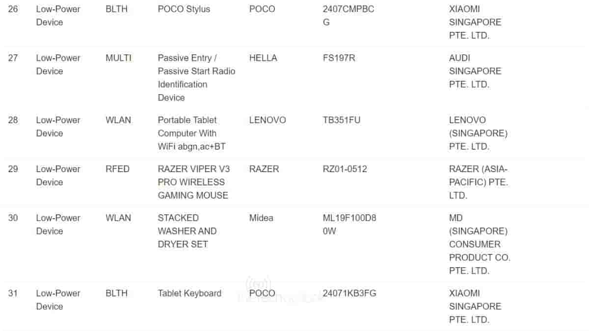 Xiaomi is nowadays gearing up for the launch of POCO‘s first tablet that has already received EEC certification. A few days ago a stylus under the POCO brand name appeared on FCC with the model number “2407CMPBCG”. And now once again this stylus has been spotted on a certification website. It has been spotted on the IMDA certification website along with a tablet keyboard with model number “24071KB3FG” and under the same brand name POCO. It means the upcoming POCO tablet will not be seen alone but will come with a stylus and keyboard at some additional cost as it happens. The listing does not reveal anything as such but does point toward its near launch in the market.