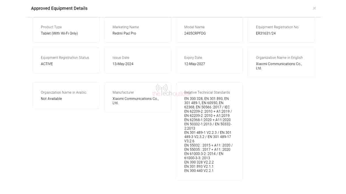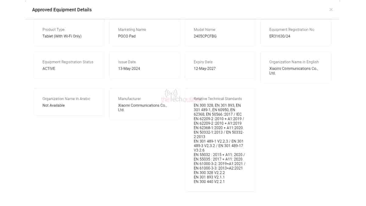 This will be Poco’s first tablet and has already been spotted on EEC, IMDA, Camera FV-5, and FCC with the model number “2405CPCFBG”. Previously, it wasn’t known what name Poco might give its first tablet. However, thanks to the TDRA certification, it has been revealed as the “Poco Pad”, listed under the same model number “2405CPCFBG” with the registration number “ER31630/24”. Through the TDRA certification, it has also been revealed that this will be the WiFi-only version.