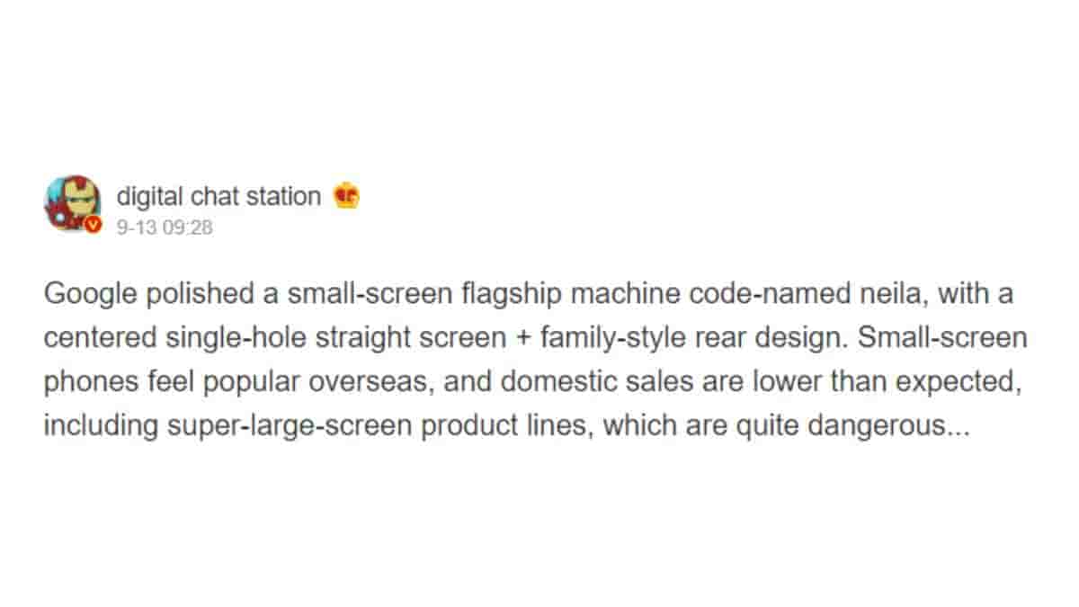 According to Digital Chat Station on Weibo, Google is developing a “small-screen flagship machine” to complement the company’s smartphone line of products. The device would include a centered hole-punch layout on the front and a “family-style” look on the back, supposedly to match the look of the next Pixel generation.