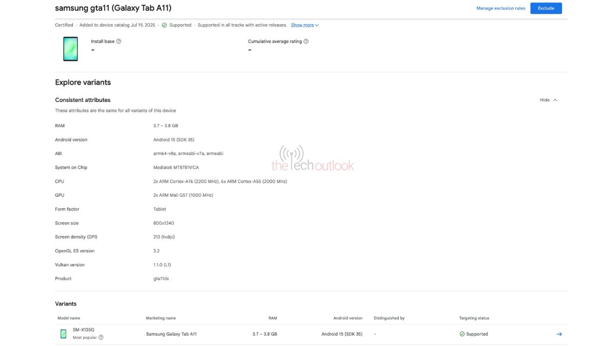 The Samsung Galaxy Tab A11 tablet LTE version that carries the model number of ‘SM-X135G’ has been listed on the Google Play Console database, and specs such as MediaTek Helio G99 chipset (clocked at 2.20GHz), ARM Mali G57 GPU, Android 15 OS, 4GB RAM, and 800 x 1340 pixels resolution display (with 213 tvdpi screen density) have been revealed for the device. As mentioned, its front look image has also been listed, pointing out design aspects like the flat display with thick bezels, front-facing camera at the top bezel when held in portrait mode, and volume rockers + power button at the right side panel.