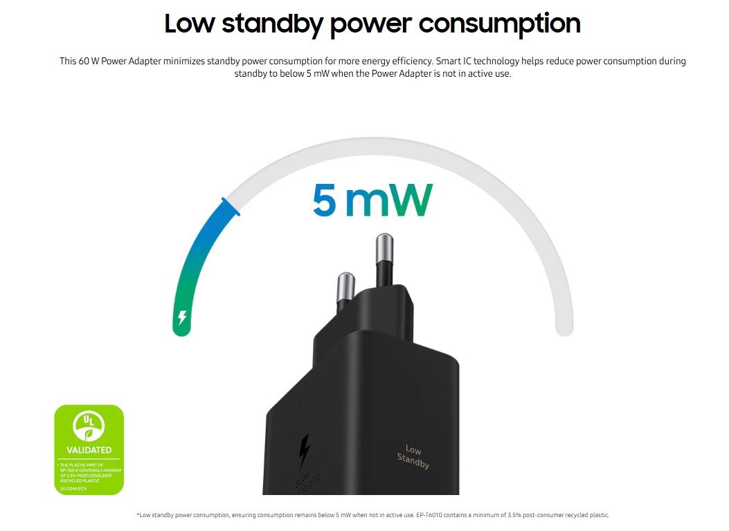 The charger supports Power Delivery (PD) 3.1 and PPS (Programmable Power Supply), enabling Samsung’s Super Fast Charging (SFC) 2.0 on compatible devices that support USB PD 3.1 and direct charging. PPS adjusts voltage and current in real time based on the connected device’s requirements. This helps improve efficiency and reduce heat generation. It also mentions that the charger comes with Smart IC Technology, which helps lower power usage during standby to below 5 mW when not in active use.