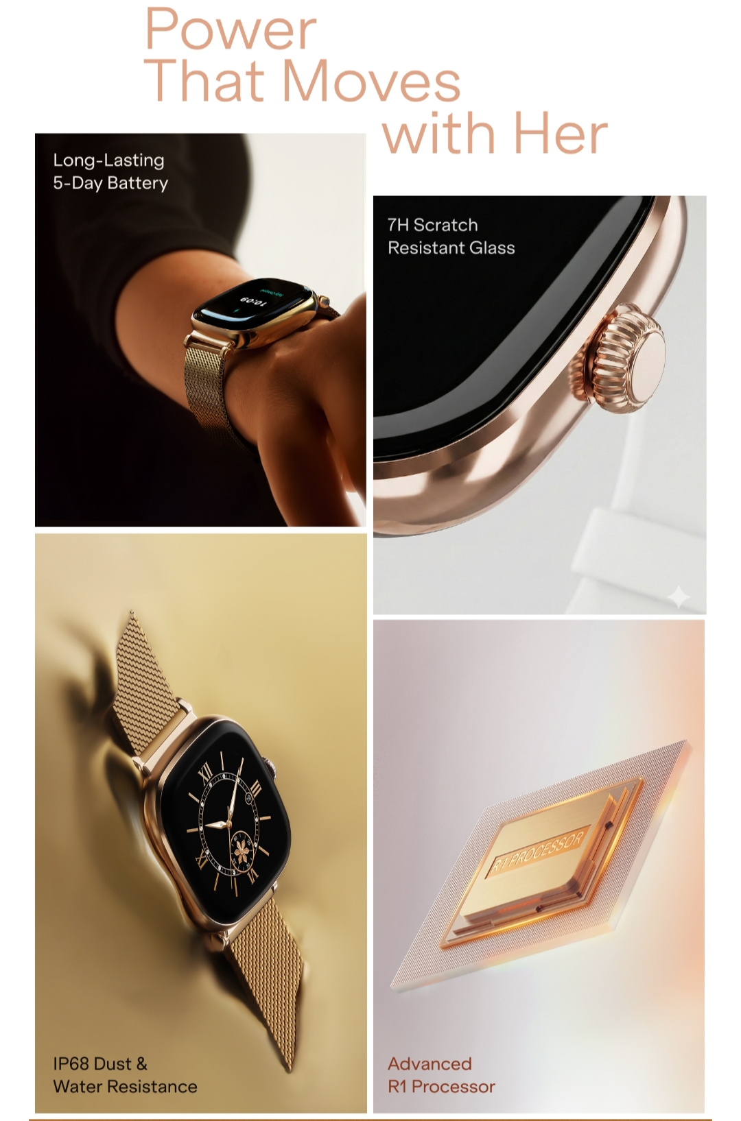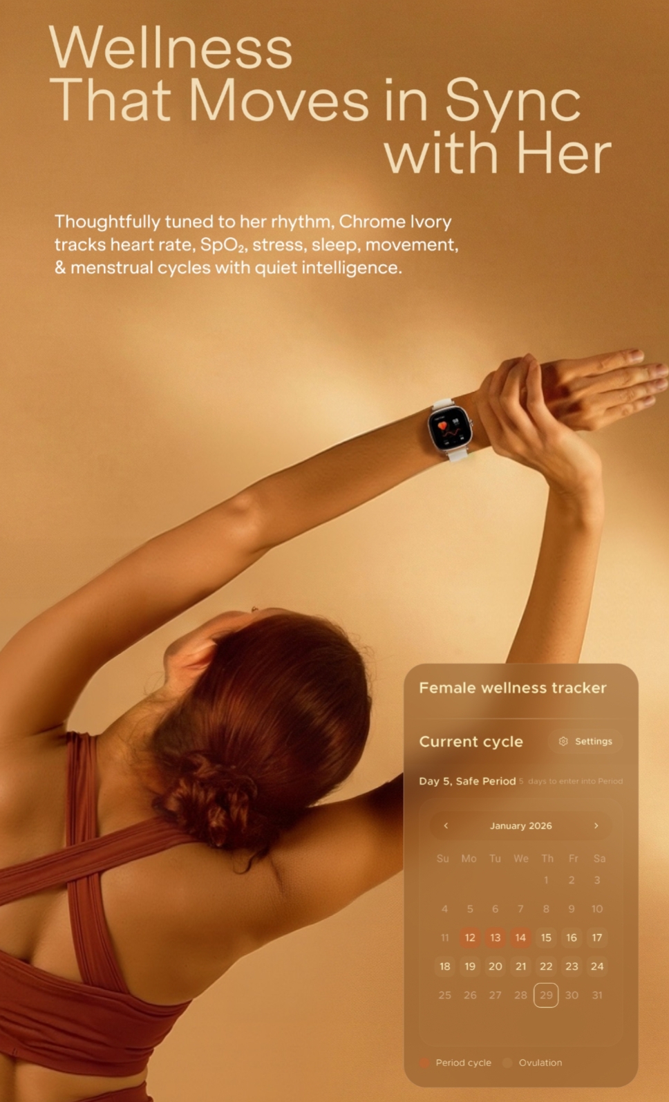 The wearable is equipped with an advanced R1 processor. It offers a long-lasting 5-day battery and arrives with IP68 Dust & Water resistance. boAt Chrome Ivory tracks heart rate, SpO2, stress, sleep, and movement. The Female Wellness Suite offers gentle reminders for upcoming menstrual dates and ovulation stages. There are multiple customizable watch faces, multiple sports modes and smart modes like DND and Power Saving.