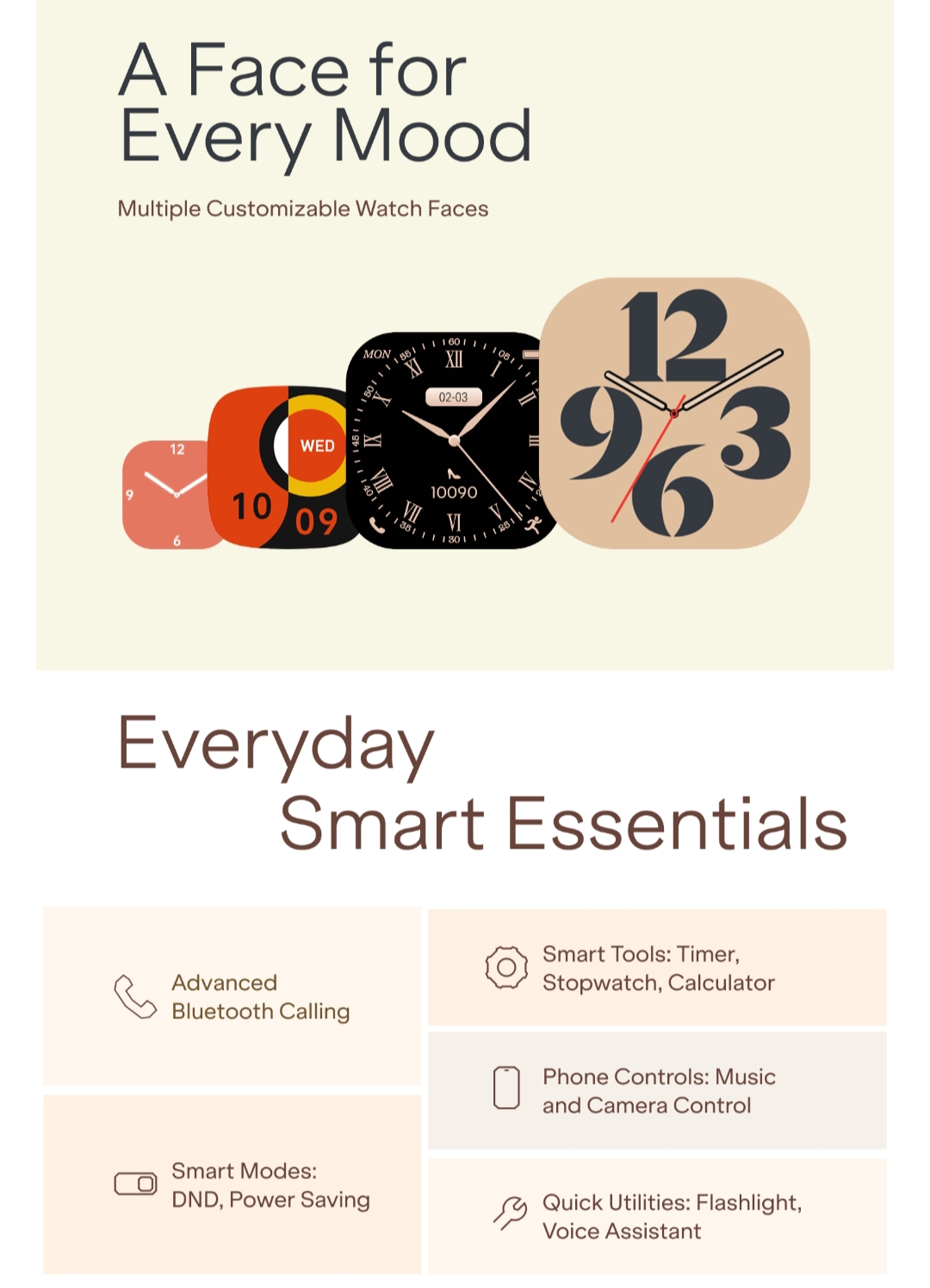 Other features include- advanced Bluetooth calling, Timer, Stopwatch, Calculator, Music and Camera control, Flashlight, smart notifications & alerts, Find My Phone and Voice Assistant.