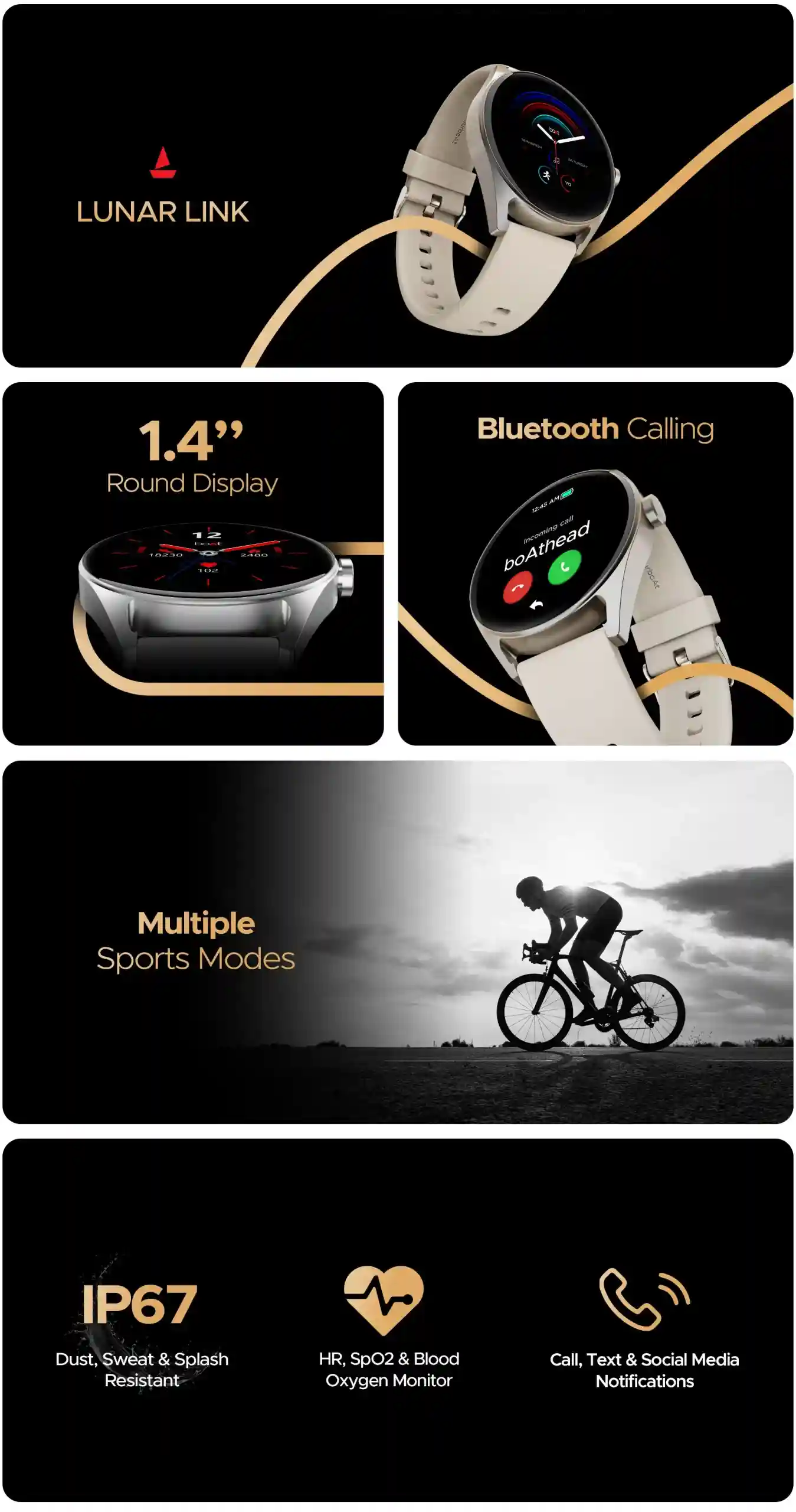 The latest boAt Lunar Link smartwatch features an immersive 1.4″ round HD display screen with a brightness rate of 500 nits, offering vivid visuals to its users at any lighting conditions. The body is also IP67-rated with dust and water resistance.