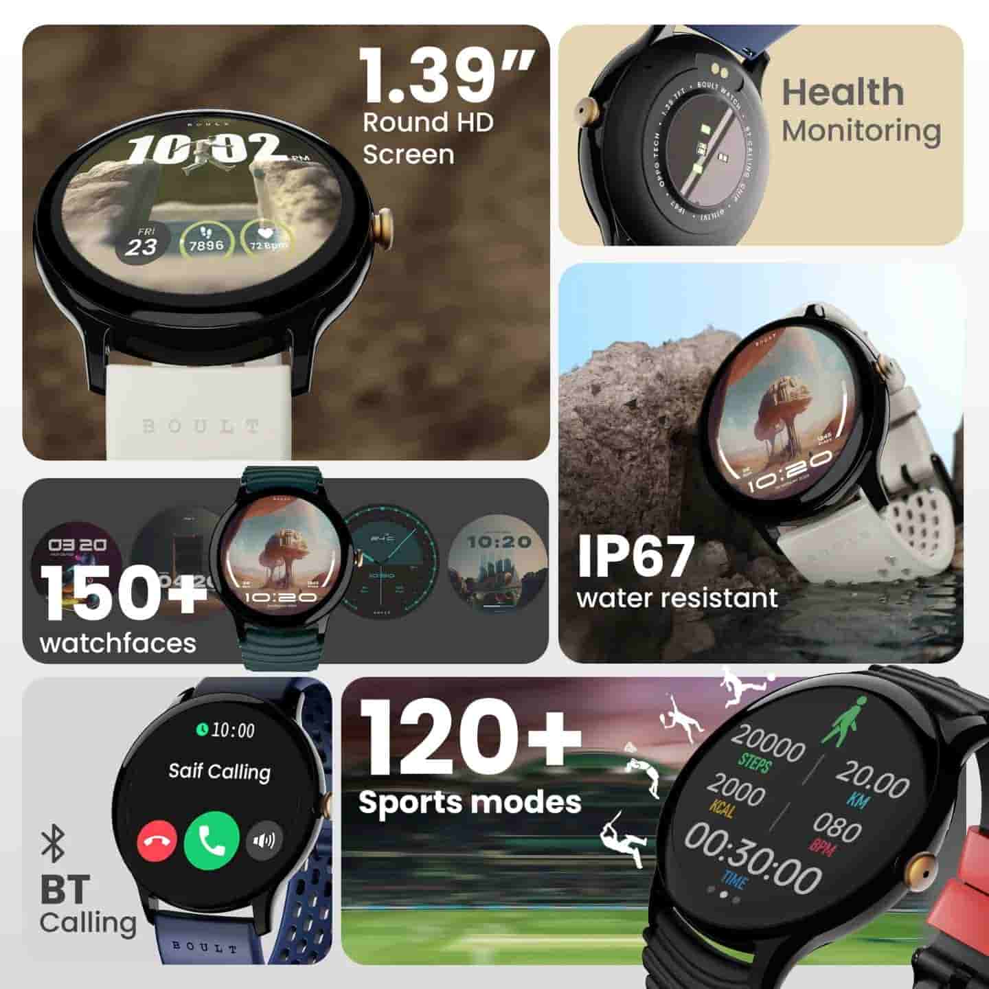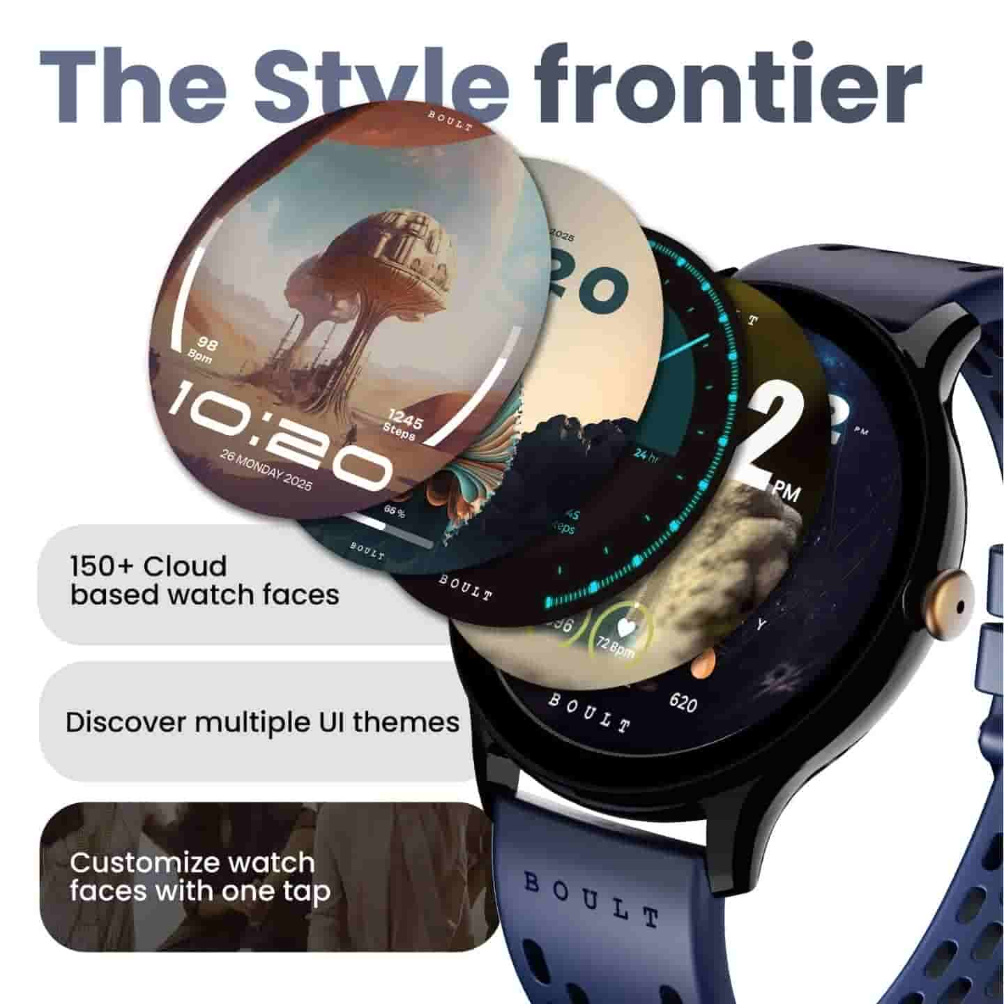 The newly launched Boult Striker Plus smartwatch features a round avant-garde HD display screen with a screen size of 1.39 inches. Boult also offers 150+ cloud-based watch faces along with multiple UI themes, enabling users to easily customize their device with a single tap.