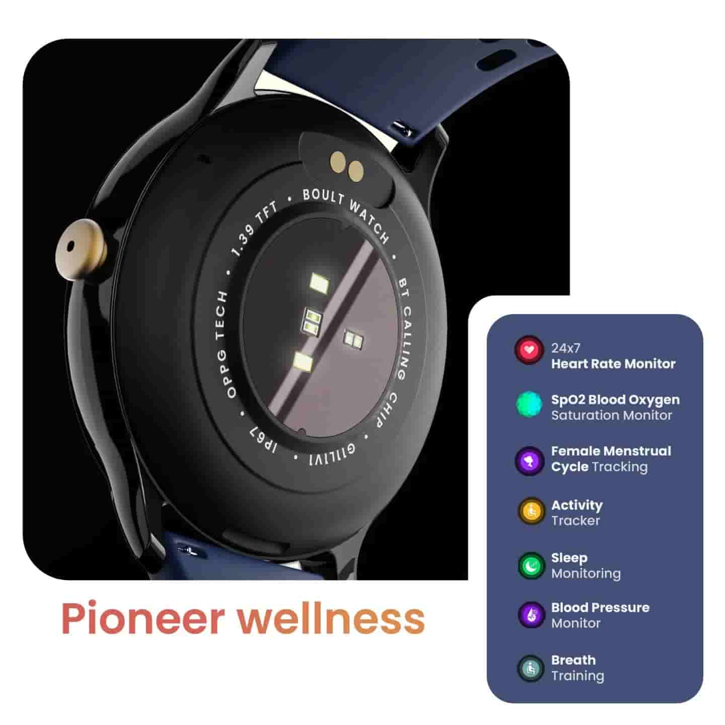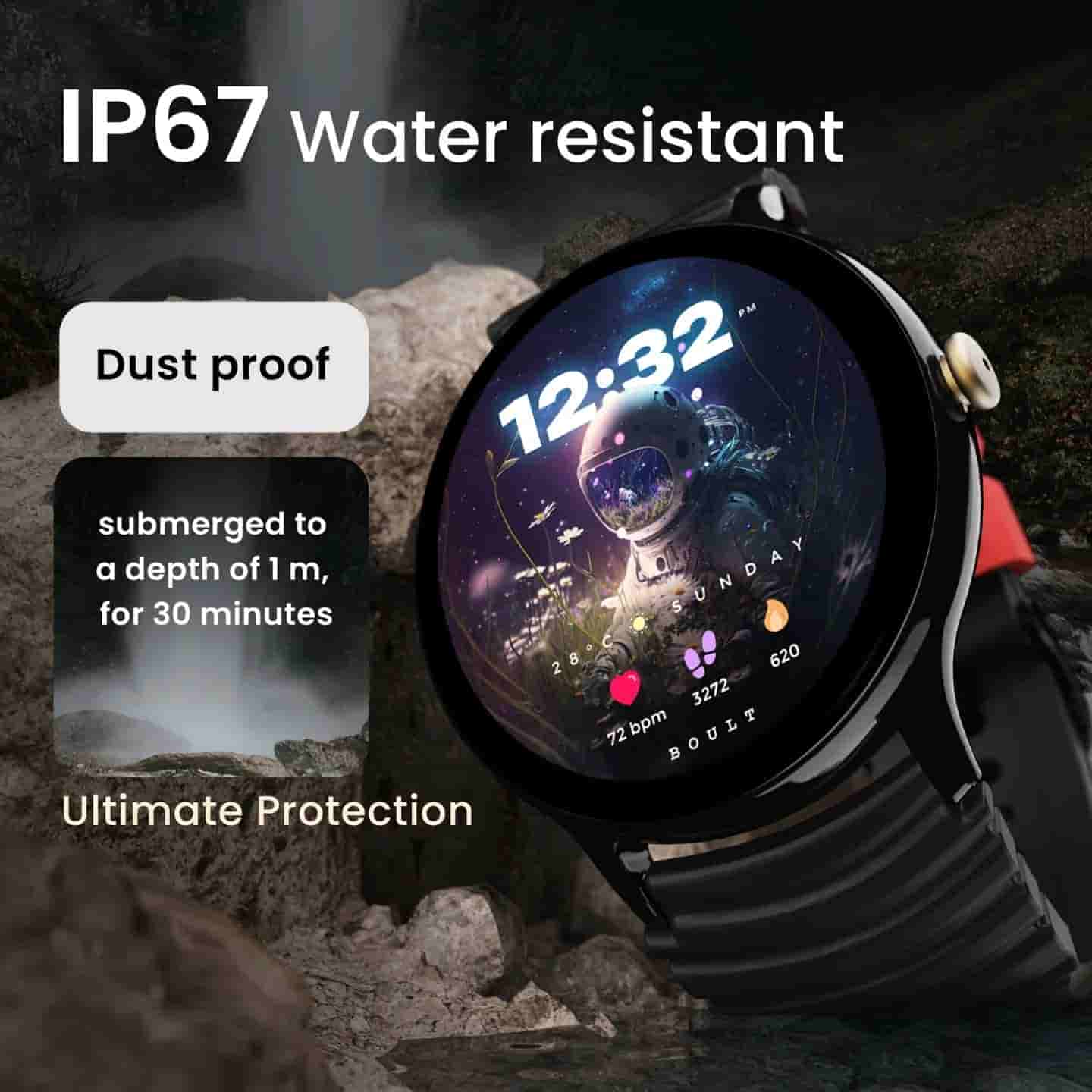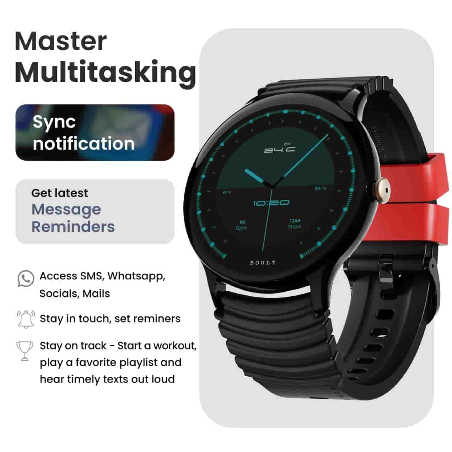 The Boult Striker Plus smartwatch is also IP67 water-resistant and dustproof. It has a zinc alloy frame and comes in four different strap color options of Black, Emerald, Blue, and White.
