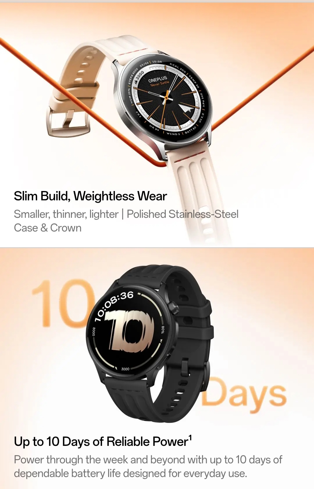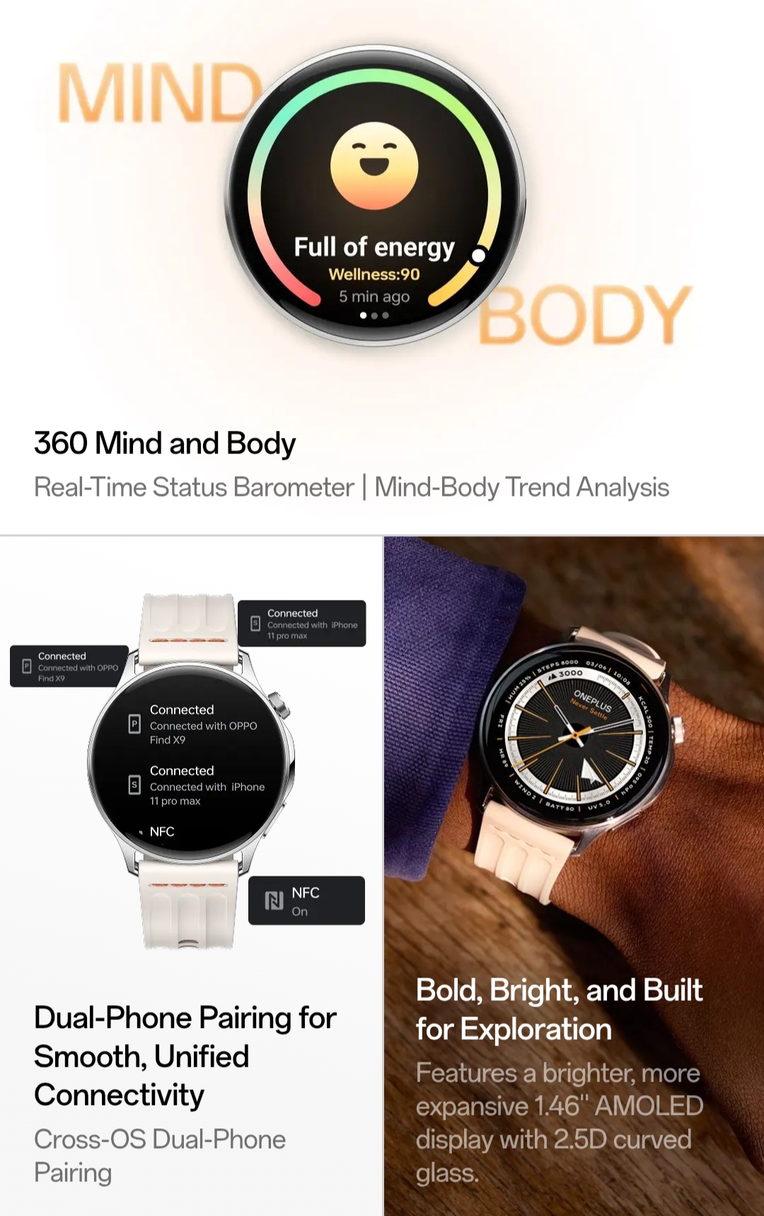 It runs on OxygenOS Watch 7.1 and supports Bluetooth 5.2, NFC (access cards only), dual-band L1+L5 Beidou, GPS, Galileo, GLONASS, and QZSS. The smartwatch supports smartphones with Android 9.0, iOS 14.0 and above, and cross-OS dual-phone pairing. It measures 44.98×44.98×8.9mm and weighs 35g (excluding wrist strap). It supports 350+ watch faces.