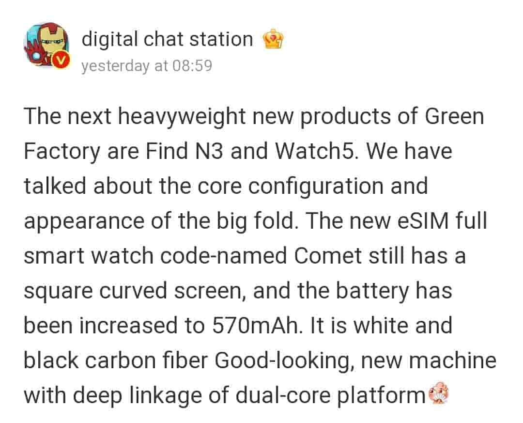 Tipster revealed that Oppo Watch 5 is codenamed “Comet” and will come with a square display with curved edges. It will be powered by a 570 mAh massive battery with support for eSIM connectivity. As far as its color option is concerned it will come in white and black carbon fiber shades.