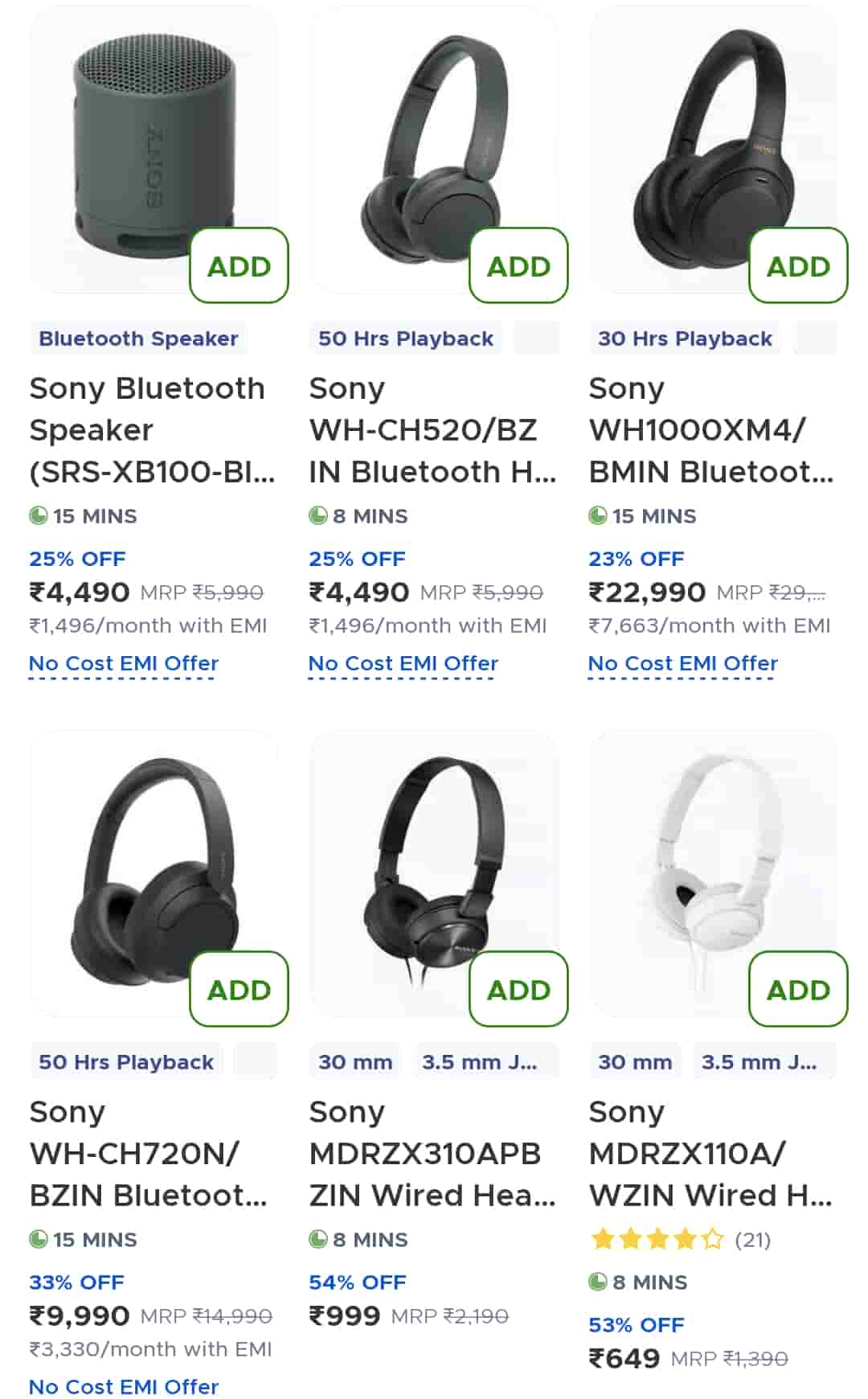 Sony’s best audio gear- earbuds, speakers, headphones, and wired earphones are now available via Blinkit. On searching on the Blinkit app, I found several Sony audio products listed that are available for purchase via the platform.