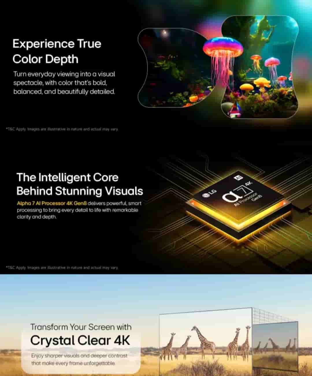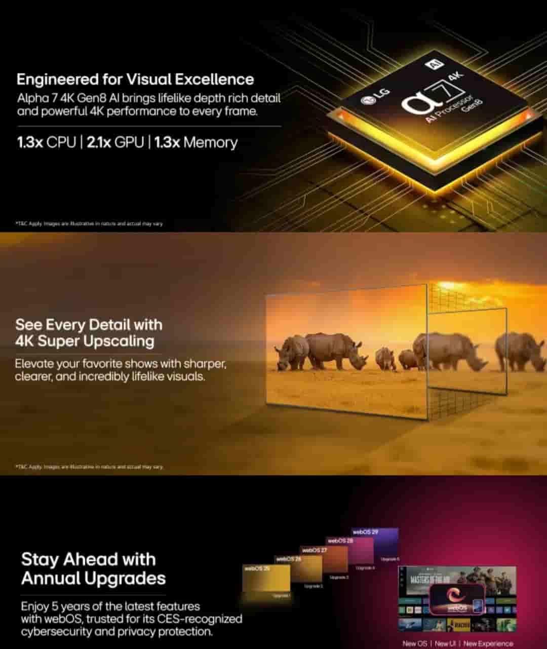 The TV will offer True Color Depth that turns everyday viewing into a visual spectacle. It will be powered by Alpha 7 AI Processor 4K Gen8 that delivers smart and powerful processing with remarkable clarity and depth. Users can enjoy sharper visuals and deeper contrast with Crystal Clear 4K resolution. The TV will get 5 years of continuous upgrades (webOS 25, webOS 26, webOS 27, webOS 28, webOS 29) combined with CES-recognized security.