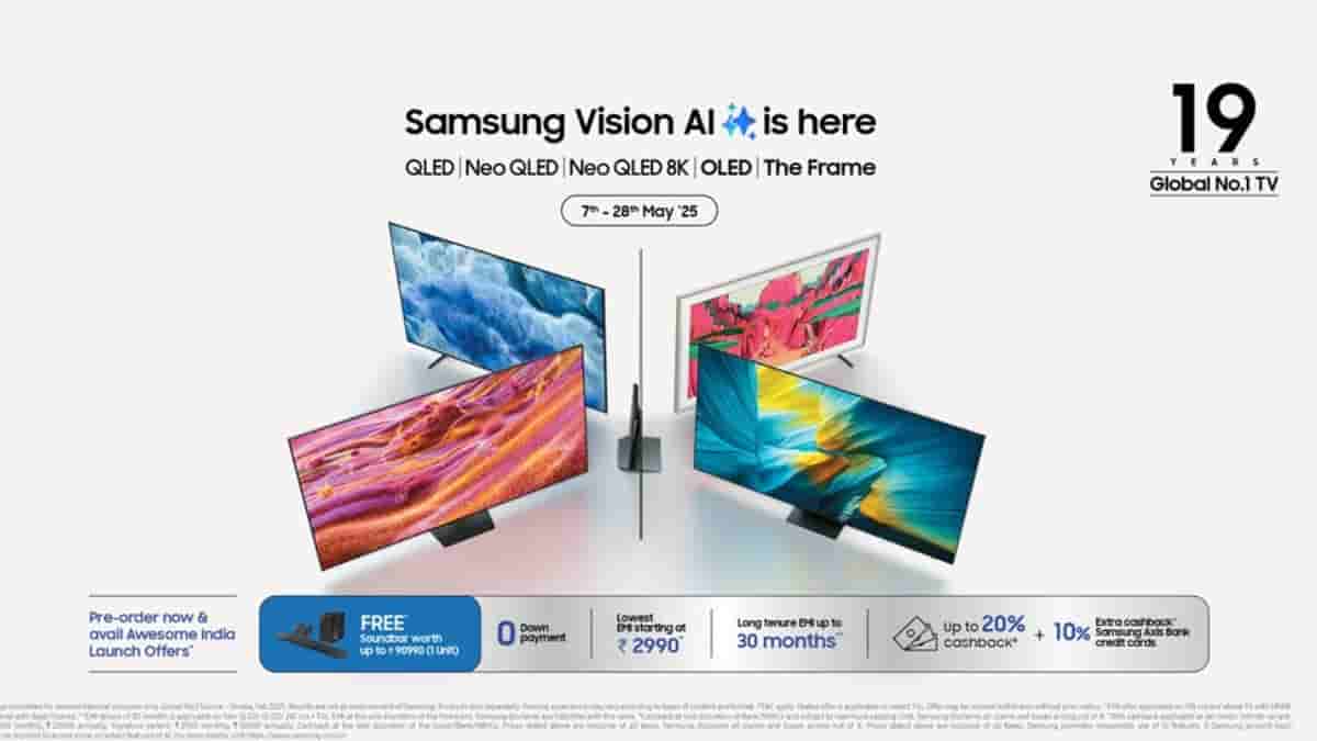 The 2025 lineup of Neo QLED 8K, Neo QLED 4K, OLED, and The Frame TVs is available for pre-order across Samsung retail stores, Samsung.com, and leading offline and online retail channels. As part of the pre-order offer, consumers purchasing Neo QLED 8K, Neo QLED 4K, OLED TVs and The Frame can avail exciting benefits such as a Free Soundbar worth up to INR 90990, cashback of up to 20%, Easy EMI with zero down payment, lowest EMI starting INR 2990 and up to 30-month EMI tenure. These offers are valid till May 28, 2025.