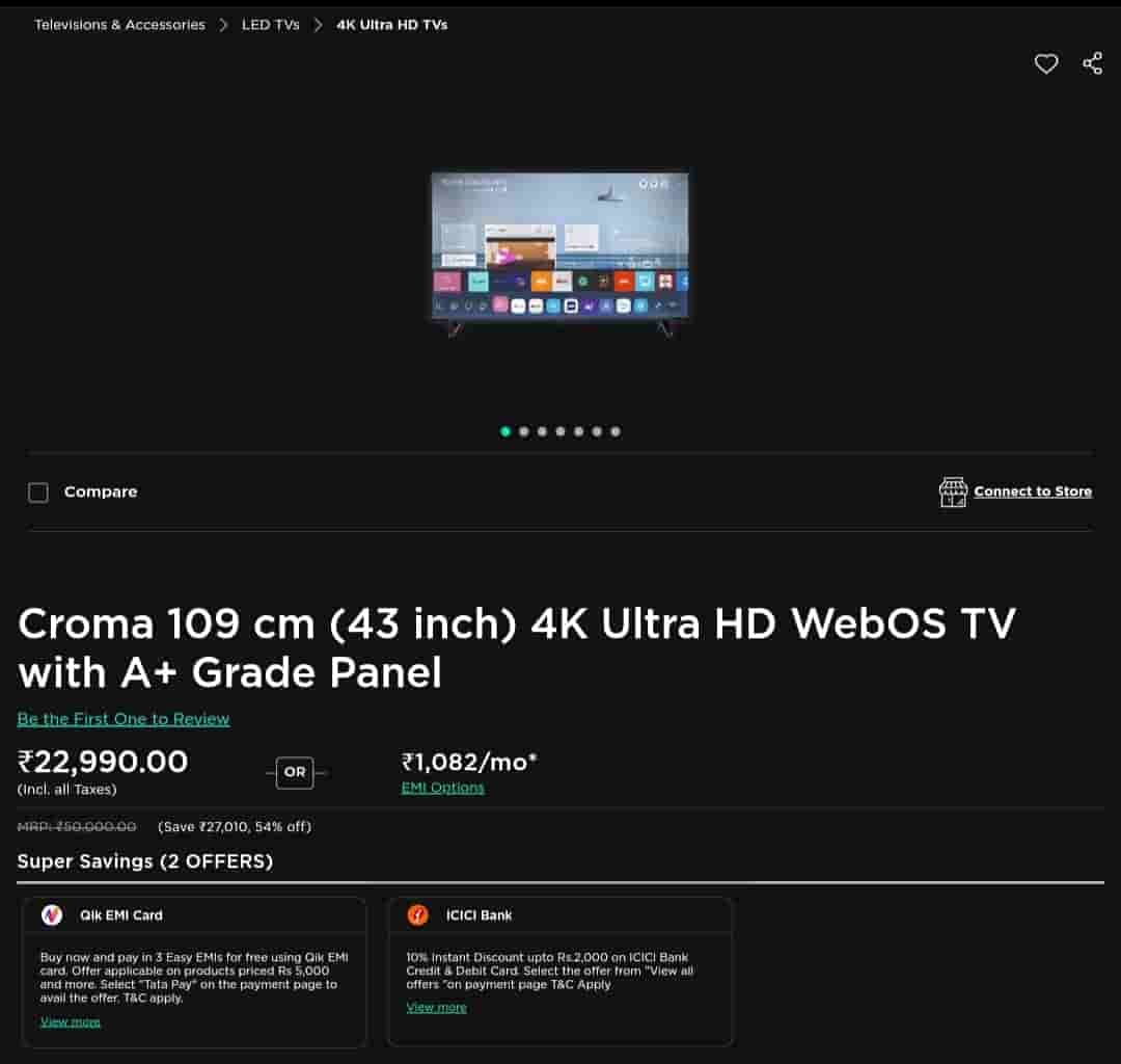 Want a Smart TV to enhance your interior? Buy Croma 43 inch 4k ultra HD WebOS TV which will blend with your interior just at Rs 22,990 , check here