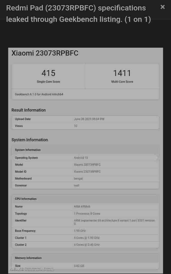 Redmi Pad 2 received a 415 single-core score and 1411 multi-core score as per the listing while some of its specifications have also been confirmed.