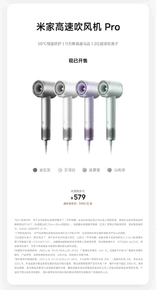 Xiaomi’s new Mijia High Speed Hair Dryer Pro comes with specs like 50° C constant temperature blowing, 110,000 RPM high speed motor, and 200 million ultra-concentrated negative ions. It is also available for purchase, at CNY 579 discounted price (national subsidy – CNY 492.15), with color choices of Rock Gray, Fritillary White, Misty Purple, and Mountain Green.