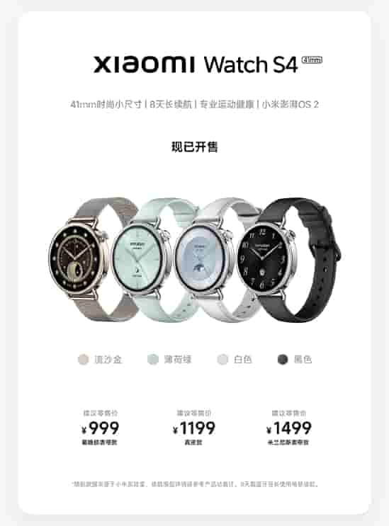 The Xiaomi Watch S4 41mm smartwatch model with a 41mm stylish small screen, Xiaomi HyperOS 2, professional sports and health features, and 8-day long battery life was also introduced at the event and is now on sale. Its Fluororubber (Mint Green and Black), Genuine Leather (White), and Milanese (Quicksand Gold) strap options are priced respectively at CNY 999, CNY 1199, and CNY 1499 (suggestive retail price).
