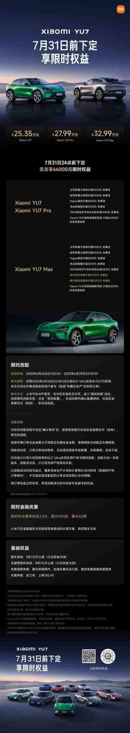 At this same event, the brand’s first electric SUV – the Xiaomi YU7 was also released. Its standard, pro, and ultra versions are priced at CNY 253,500, CNY 279,900, and CNY 329,900 respectively, and a total of 9 different colors are made available to customers. Interested customers can place an order by paying a deposit of CNY 5000, and until the 31st of July 2025, customers ordering the Xiaomi YU7 SUV can enjoy limited-time benefits worth up to CNY 66,000. Also, till the 29th of June 2025, customers who ordered and haven’t received the Xiaomi SU7/SU7 Ultra yet, if interested, can switch the order and purchase the YU7 instead.