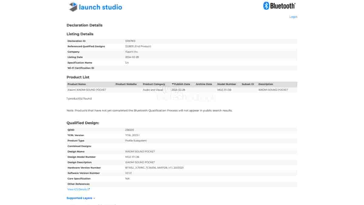 Xiaomi Sound Pocket spotted on Bluetooth SIG certification website