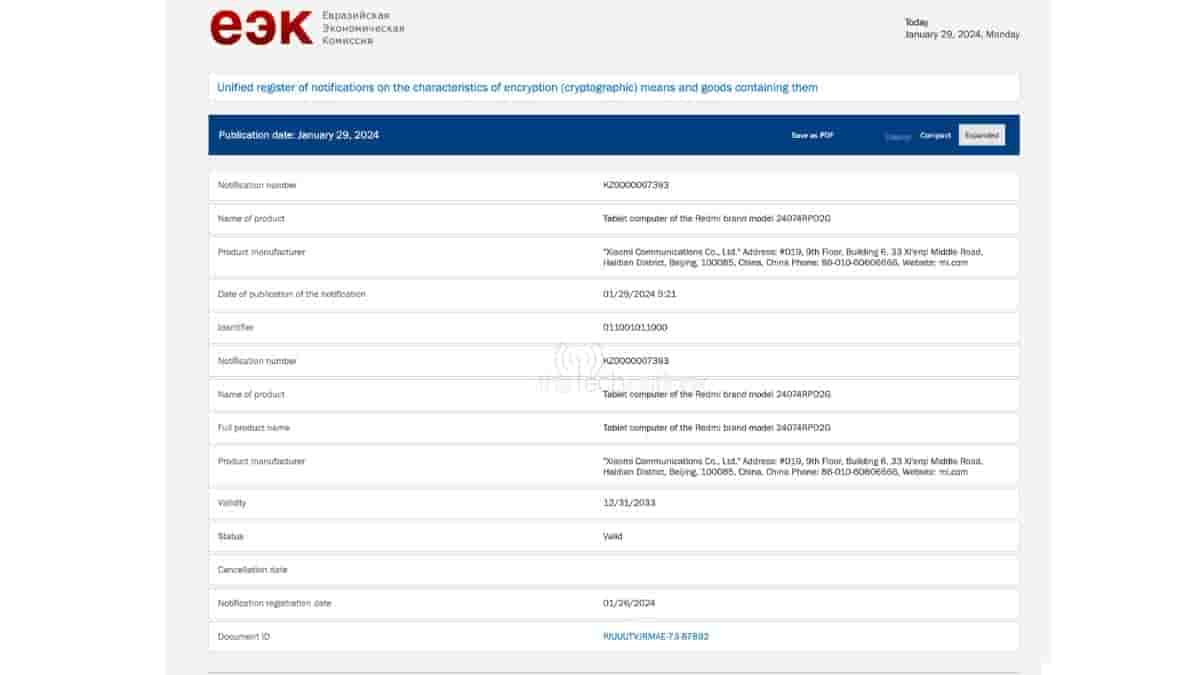Redmi tablets bearing the model numbers – “2405CRPFDG” and “24074RPD2G” have been spotted on the EEC database and the two have received the EEC certification with notification numbers – “KZ0000007392” and “KZ0000007393” respectively. The validity of the certification for the two devices will be till the 31st of December 2033.