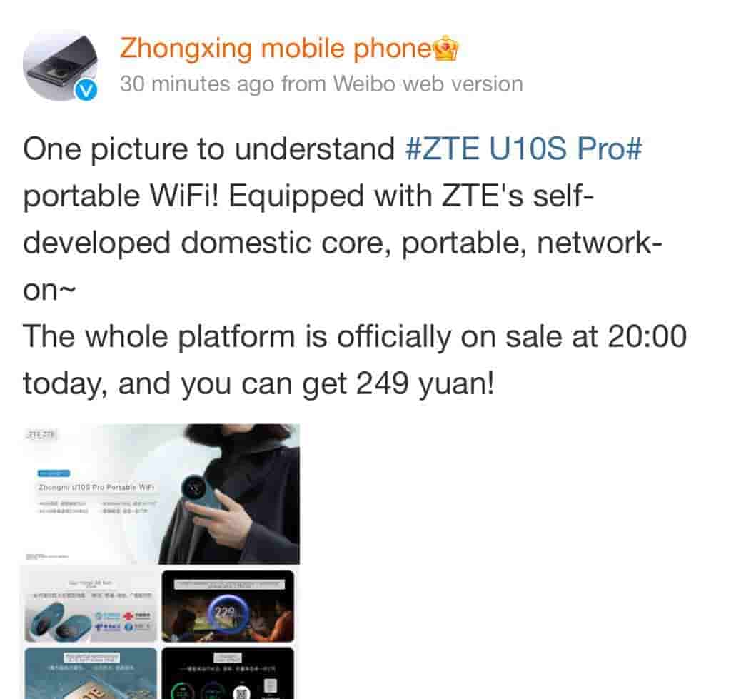 The Chinese consumer electronics maker, ZTE listed its latest U10S Pro portable Wi-Fi device on the JD(Jingdong) shopping platform of China a few days back, opening the pre-sales for the product within the country. Now, via the company’s Weibo handle, the brand has officially announced that the device will be made available for sale today, at 8 PM local time, with a price tag of CNY 249(about Rs. 2,832).