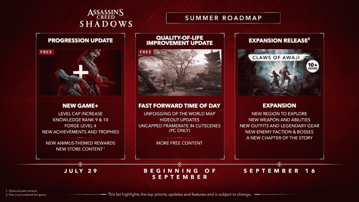 Previously, Ubisoft released features including collaborations with Dead by Daylight, new allies, Parkour improvements, and the severe Nightmare mode. This includes improved map unfogging, a time-skip tool for adjusting the in-game clock, uncapped frame rates on PC, and enhancements to the Hideout and item rarity systems. On September 16, the Claws of Awaji expansion will launch, introducing a new region, additional storyline content estimated at over ten hours, and new weapons, abilities, and enemies. These updates and expansion features will be available to all Assassin’s Creed Shadows players starting on July 29.