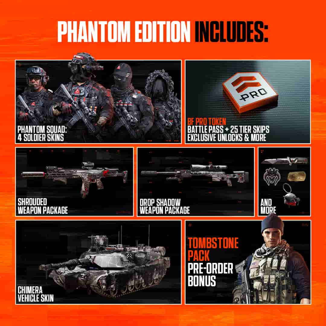 There will be a Phantom Edition for Battlefield 6 that comes with Phantom Squad: 4 soldier skins, BF Pro taken, shrouded weapon package, drop shadow weapon package, chimera vehicle skin, and more. It is available for pre-orders, and as part of the pre-order bonus, players will get the Tombstone pack.