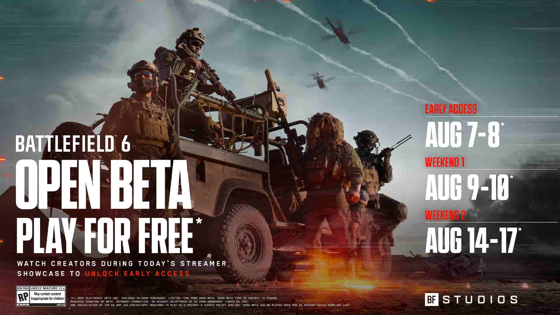 Battlefield 6 is officially confirmed to be released on 10th October. Before that, there will be three free open beta windows. The first will take place between August 7 and August 8, and is for Battlefield members and those who earn access by watching those streamers. Weekend 1 of completely open access will then take place on August 9 and 10, and Weekend 2 of completely open beta access will take place between August 14 and August 17.