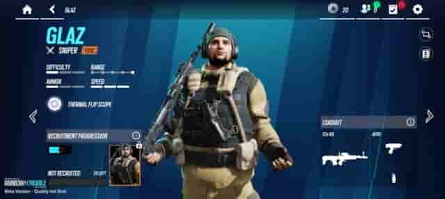 Timur Glazkoc also known by the famous name of Glaz is an sniper and currently has been deployed in Rainbow six mobile. He was born in Vladivostok, Russia, Glaz and gained his characteristic qualities while learning in an academy. These qualities motivated him to choose the army and he was soon deployed in Team Rainbow.