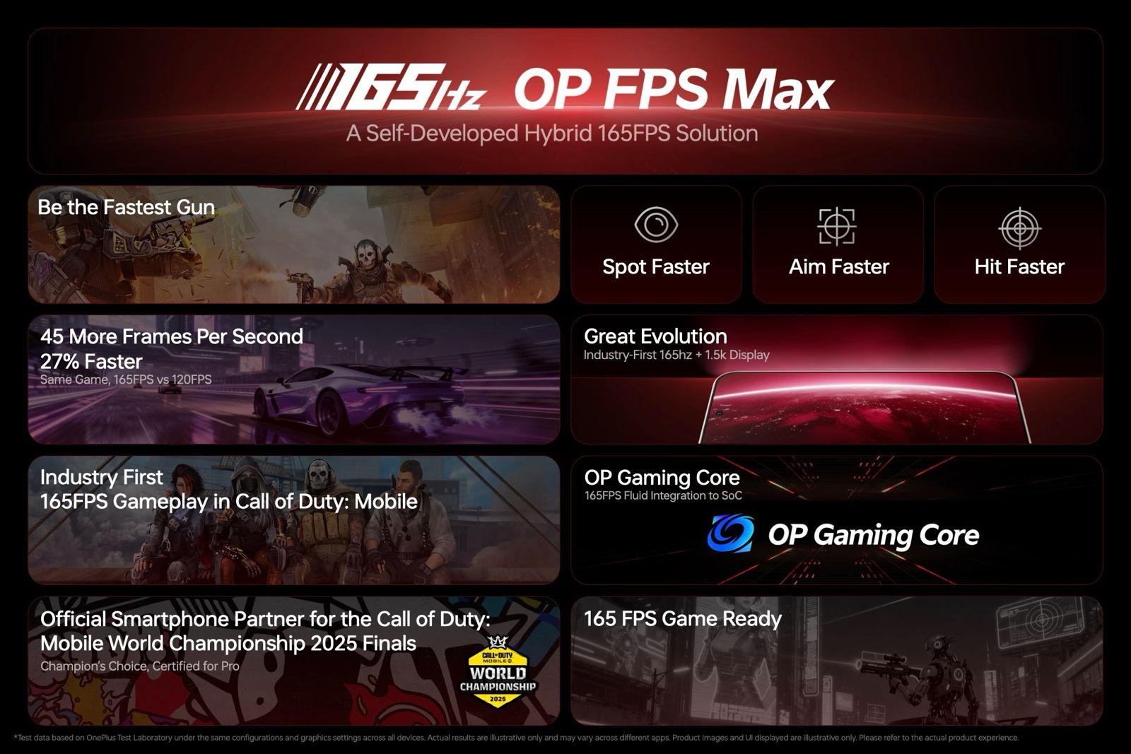 The OP FPS Max self-developed hybrid 165FPS solution is added, along with the industry-first 165Hz + 1.5K display experience. With 45 more frames per second, it is now 27% faster. Industry-first 165Hz gameplay on Call of Duty: Mobile is also a notable aspect, and it is the official partner for the Call of Duty: Mobile World Championship 2025 Finals.