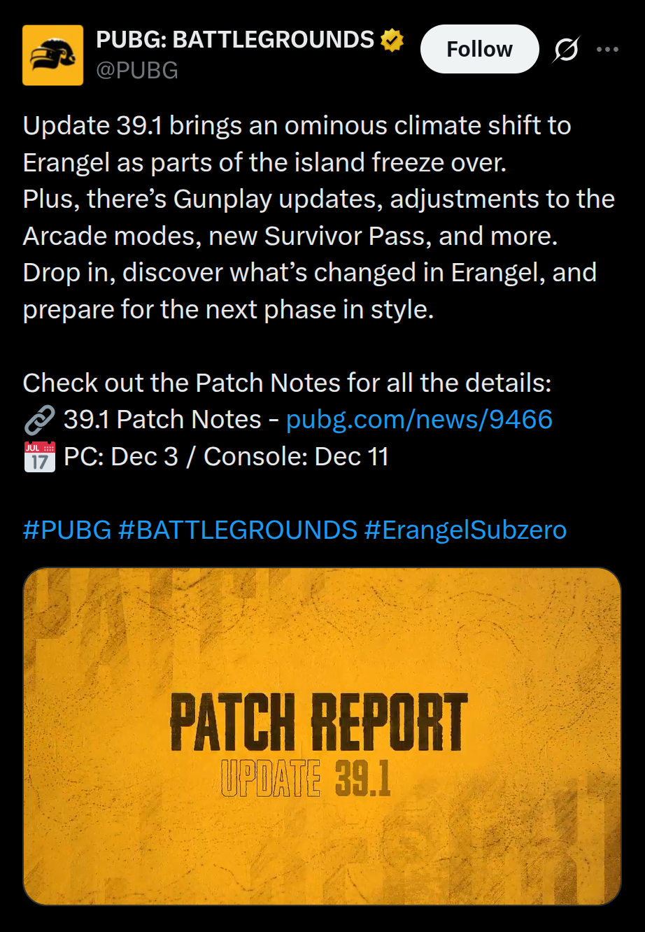 The latest Update 39.1 has been announced for PUBG: BATTLEGROUNDS, and it will be rolled out for PC users tomorrow, while console users are scheduled to get it next week. A climate shift to the Erangel area, Gunplay updates, and more are part of the update highlights.