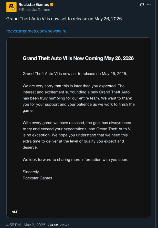 GTA VI Release – Postponed to 26th May 2026