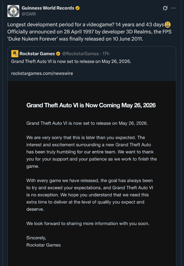 Rockstar Games Delays GTA VI Release to May 2026; Guinness World Record for Longest Video Game Development Period?