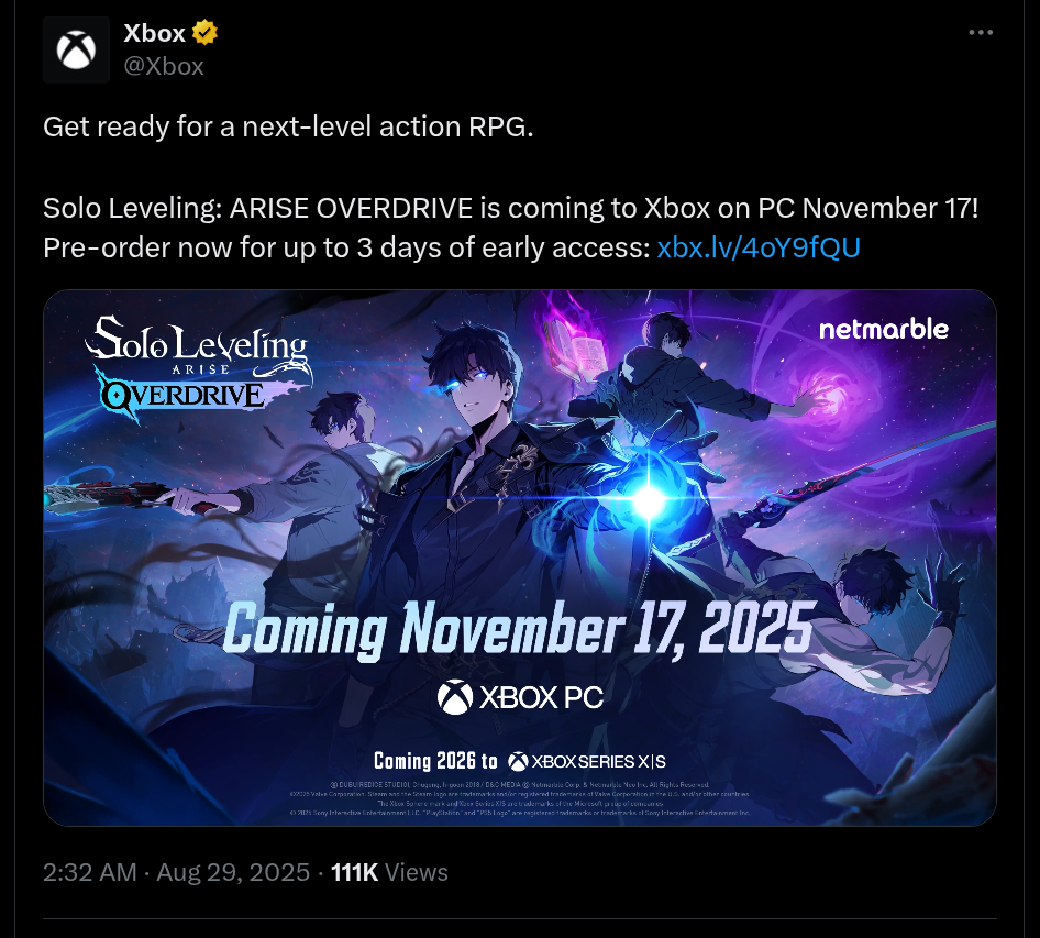Microsoft Xbox has now announced the arrival of a new role-playing action game for PC and it will be brought out two months later on the 17th of November 2025. This is about the Solo Leveling: ARISE OVERDRIVE from Netmarble, and it is now available for pre-order for up to 3 days of early access at a price of INR 2,399. Its Deluxe Edition on the other is put up for pre-order at INR 2,599.