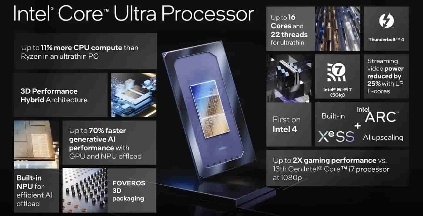 Intel Core Ultra 7 165H is said to offer up to 11% faster multi-threaded performance than AMD Ryzen 7 7840U, Apple Silicon M3, and Qualcomm Snapdragon 8cx Gen 3 at similar power. The processors arrive with a 3D Performance architecture. Other than this the Intel Core Ultra processor offers up to 70% faster generative AI performance with GPU and NPU offload. The processors arrive with 3D performance hybrid architecture and Foveros 3D packaging.
