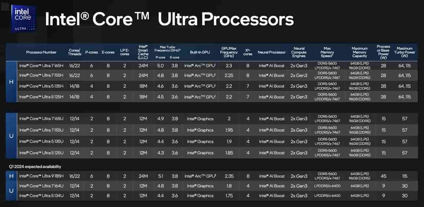 In terms of performance, the new Intel Core Ultra has tri cluster CPU- Performance cores (P), Efficiency cores (E), and Low power efficiency cores (LP E). Below is the list of all the Intel Ultra core processors and their spec sheet.