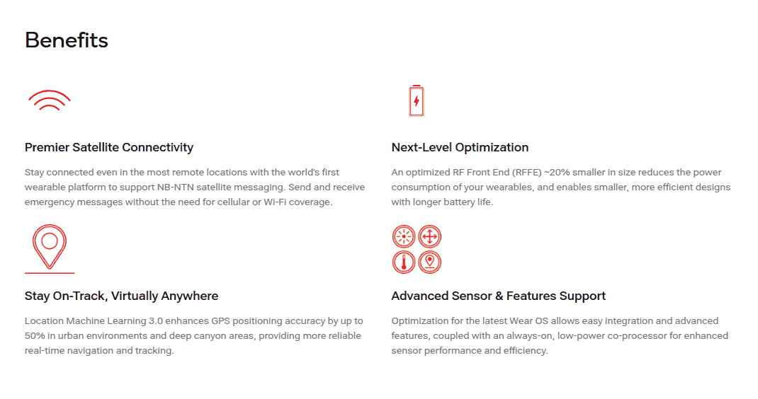 Notably, the Snapdragon W5+ Gen 2 and the Snapdragon W5 Gen 2 chips are the very first platforms to support the NB-NTN (Narrowband Non-Terrestrial Networks) connection, which will enable users to transmit and receive emergency messages via satellite when in areas without cellular or WiFi connectivity. Moreover L1+L5 Location ML 3.0 GNSS, dual ISP EIS3.0 camera, and Bluetooth v5.3 QHS are supported on the two. Display, sensors, notifications, and audio features that can be put into use in off-road scenarios have also been given on the Snapdragon W5+ Gen 2 platform.