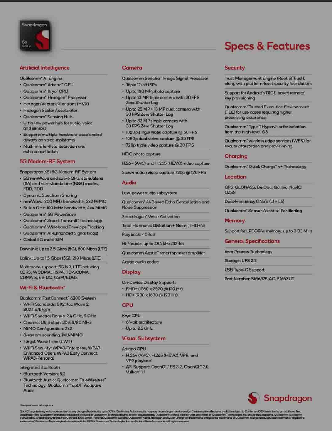 The chipset arrives with Qualcomm FastConnect 6200 system and supports dual WiFi 6 and Bluetooth 5.2 connectivity. It can support up to 108MP cameras and 720p slow-motion video recording at 120fps. It sports triple 12-bit ISPs that support multi-camera photo and video captures and offers AI-enhanced low-light imaging features. It comes with support for both FHD+ and HD+ displays at 120Hz refresh rate. The chipset enables support for Quick Charge 4+ technology while it also supports GPS, GLONASS, BeiDou, Galileo, NavIC, QzSS, dual frequency GNSS, and sensor-assisted positioning. It also offers various enhanced security and audio features.